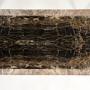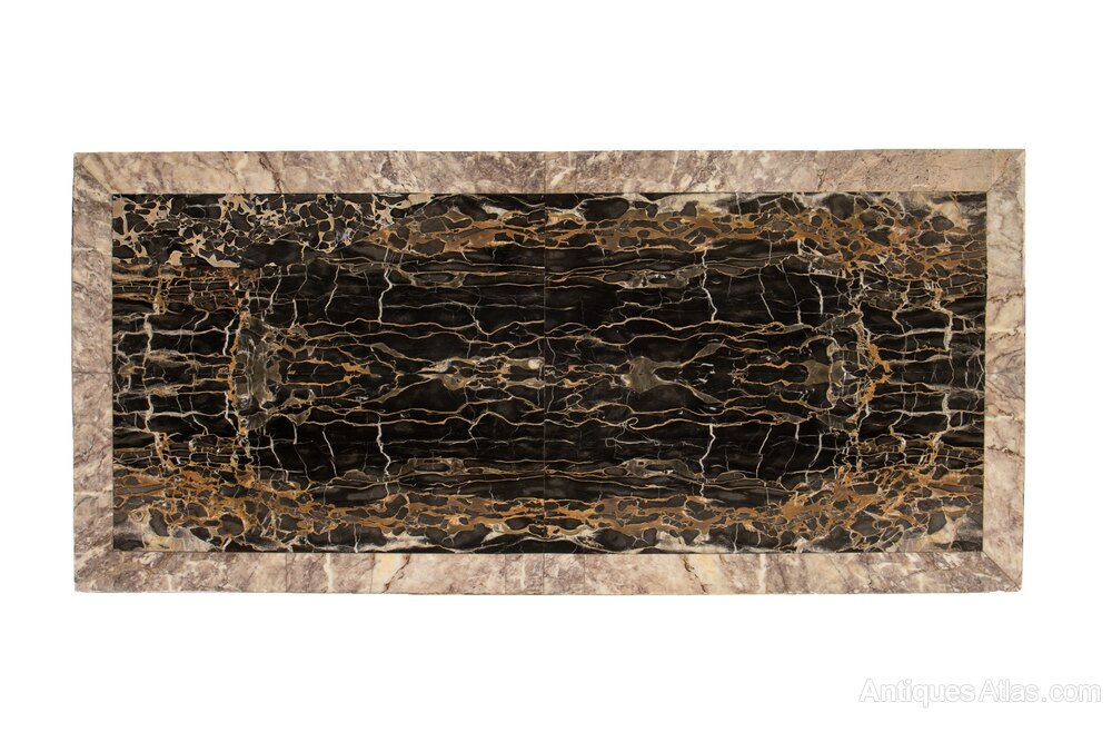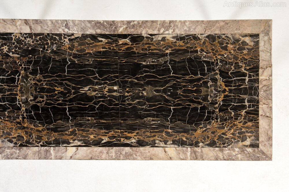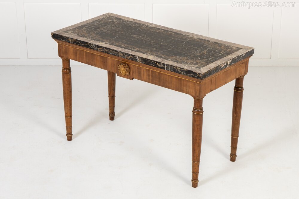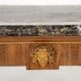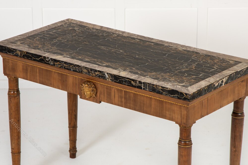 This fine Italian console or side table stands on four turned legs with giltwood mouldings to the collars and with simpler gilded mouldings used at other points as they descend towards the feet. There is also a giltwood moulding on the frieze of the table and in the centre of the frieze is an excellent ormolu Apollo mask mount. The table frame supports an exceptional veneered marble top, the veneers having been bookmatched to create an attractive and unusual veined design. The marble is likely to be Portoro marble. A contrasting marble border has been inlaid on to the edge of the top, framing the central panel.