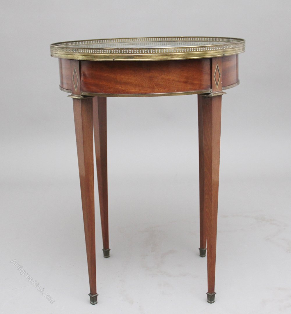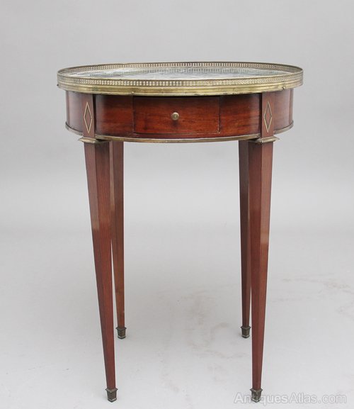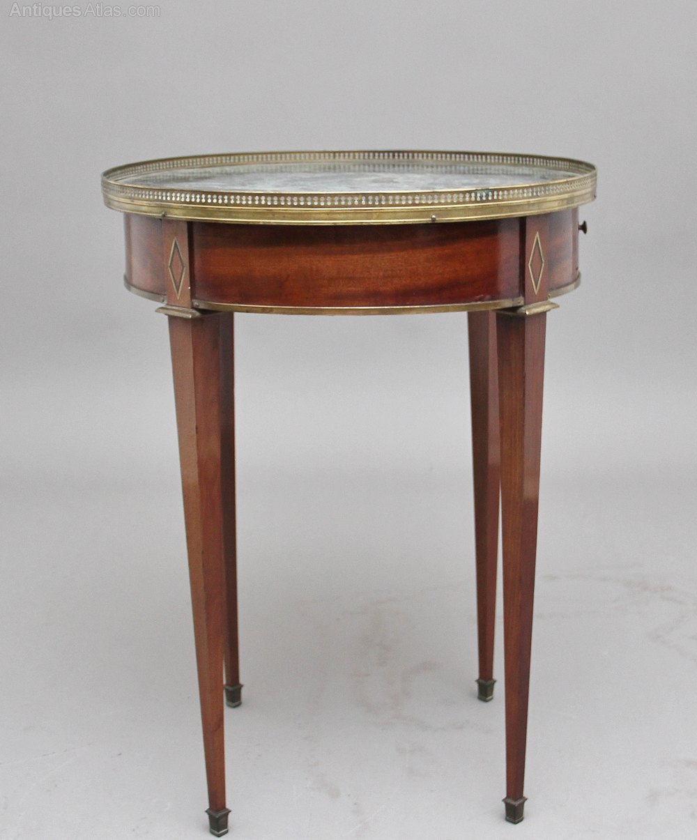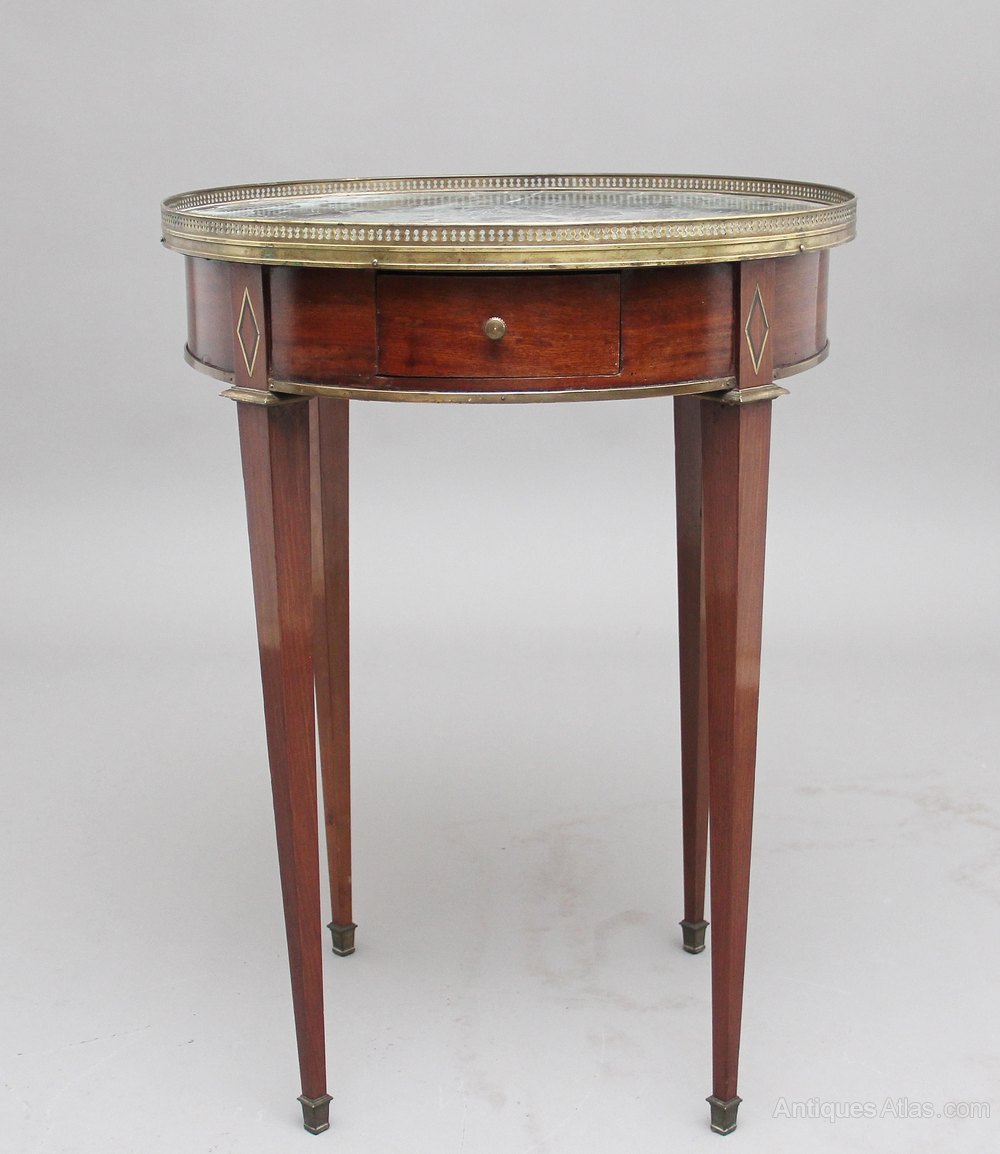 19th Century French mahogany and marble top occasional table, the circular top with a pierced brass gallery with a decorative green marble insert, the apron below having an oak lined drawer at the front, standing on square tapering legs terminating on brass caps. Circa 1870.