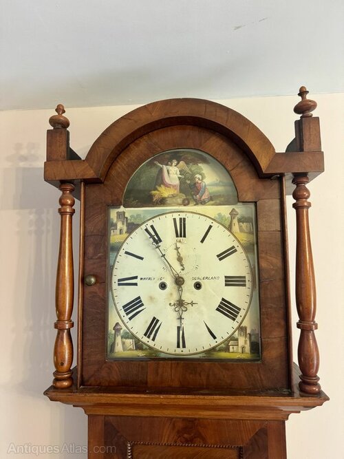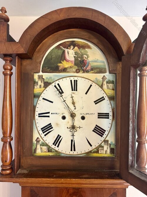 Fine quality antique 19th Century mahogany arch dial long case clock, having a quality antique Victorian long case clock with a rounded shaped hood above turned mahogany columns flanking a single glazed door casing a painted arched dial, featuring two classical figures in a pastoral setting above a circular dial with Roman numerals and the original ornate hands, the dial signed Wherly & Co Sunderland surrounded by hand painted architectural scenes, having a quality eight day movement striking on a bell, above a elegant single arched panel door opening to reveal the original pendulum and weights, standing on a quality rectangular shaped base, having the original winding key, Good condition as shown.