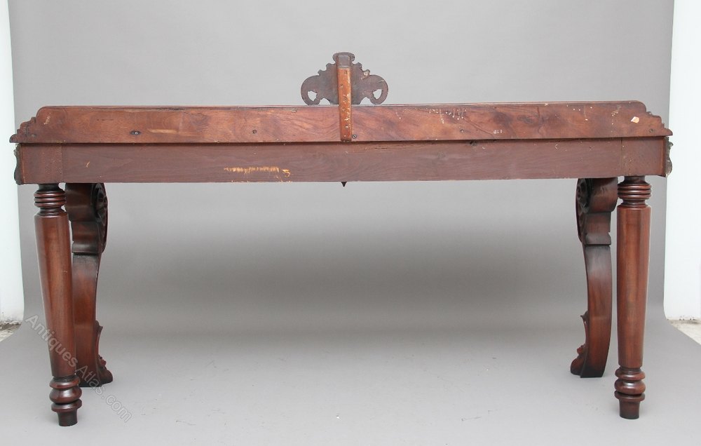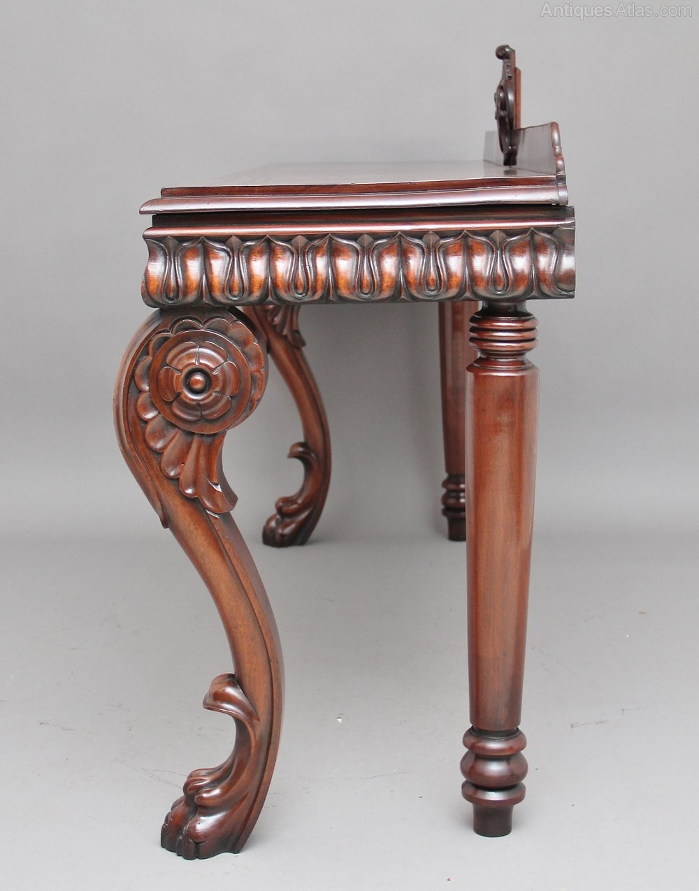 19th Century mahogany console / hall table, the rectangular moulded edge top having a raised gallery at the back and a carved feature at the centre, having a wonderfully carved tulip moulded frieze with carved shield decoration at the centre also, supported on rear bold turned legs and front carved and scroll cabriole legs with lion paw feet. Circa 1840.