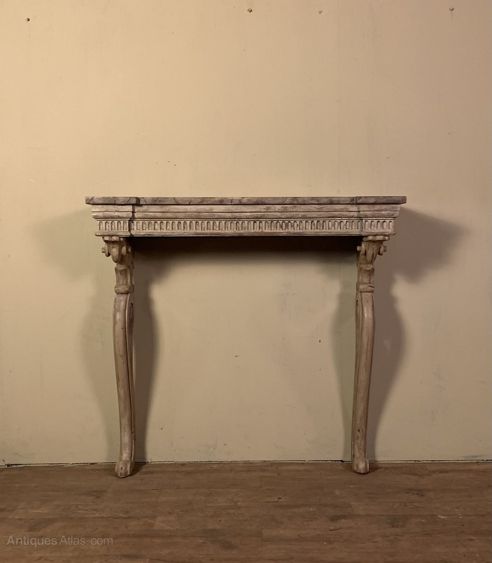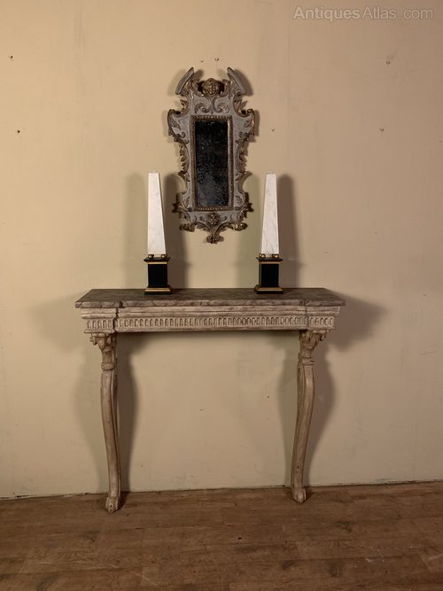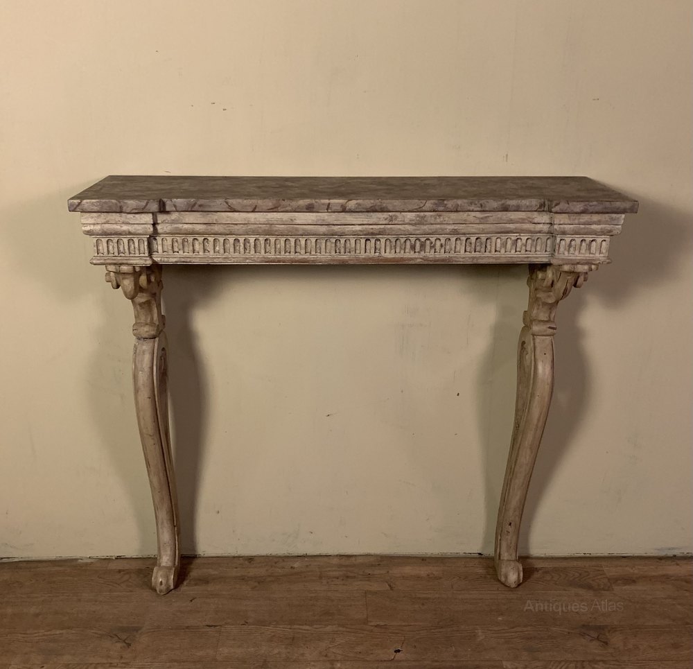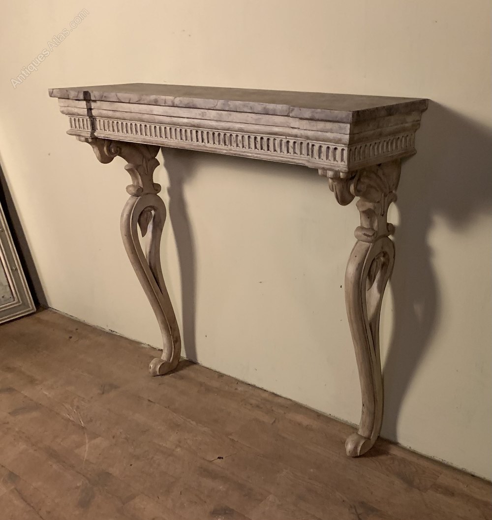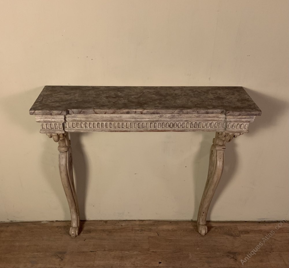 A mid nineteenth century painted console table with an inverted faux marble top above an arcaded frieze on carved scrolled supports