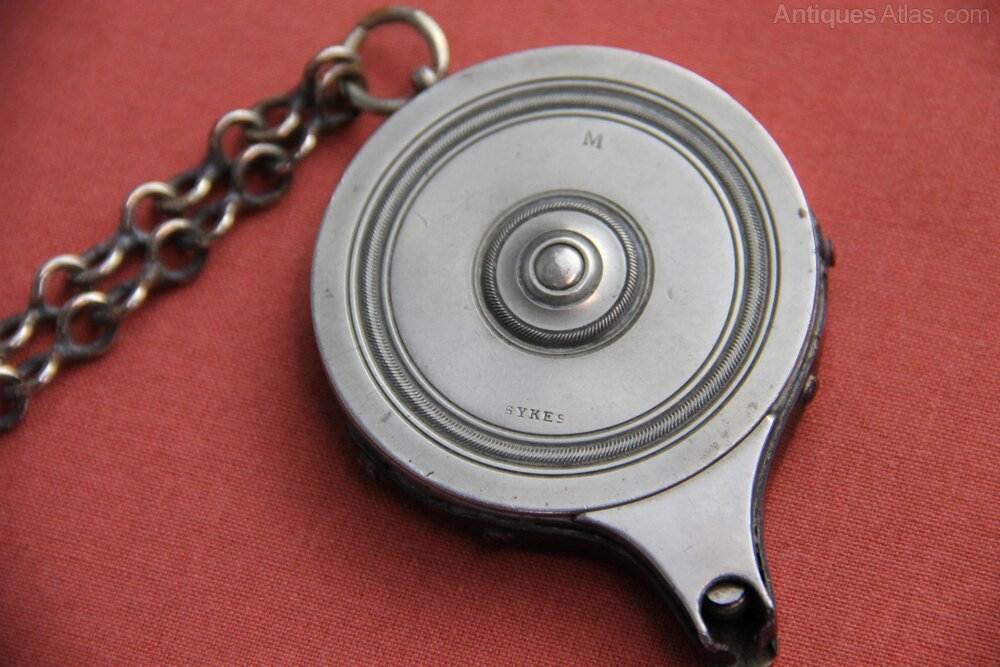19th century Percussion cap dispenser made of nickel silver. Has a turned round case with double blued spring. Case marked 'Skyes' and 'M'. On a long nickel silver hanging chain. Overall in good condition and spring is in working order.
