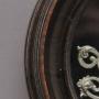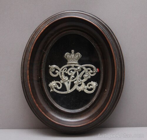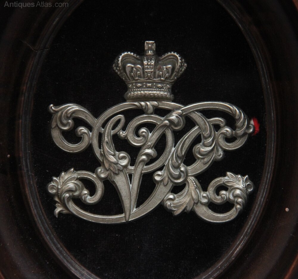19th Century royal presentation badge in an ornate oval walnut frame, the central emblem is a silvered metal of intertwined letters appear to be "V" and "R" meaning VR for Victoria Regina, Latin for Queen. Circa 1870.