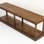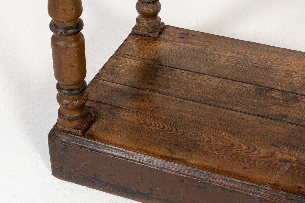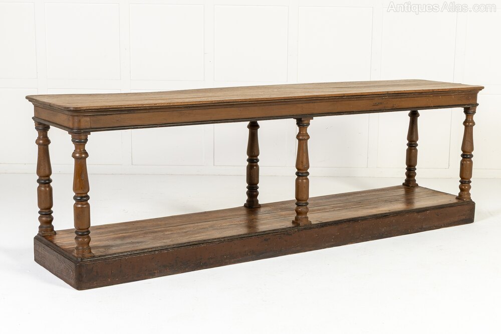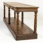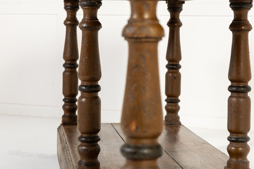 This drapers table is of typical form with a large platform base, six turned and painted legs and a drawer in the frieze. The legs retain much of their original paintwork. The top and the platform below are made of planks of oak.