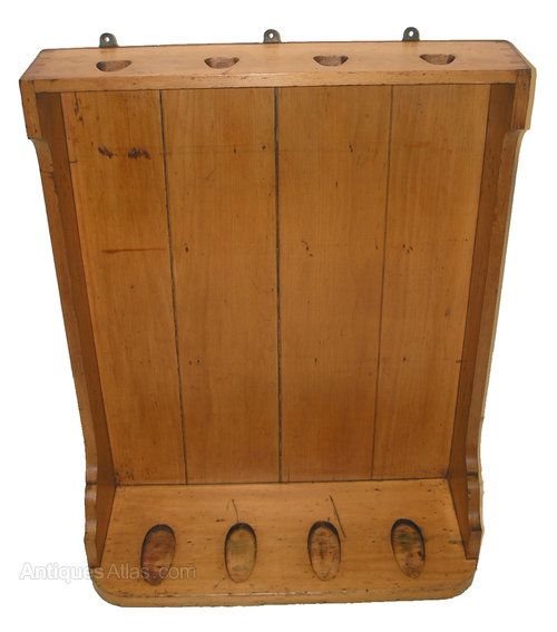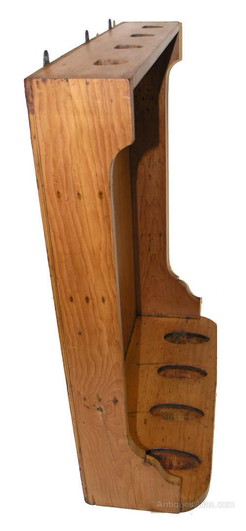 Here we have a very nice and unusual mid 19th century dovetailed pine hanging gun rack. Nice shaping to the ends, tongue and grooved back boards and all three of the original brass hanging plates. Made for four guns.