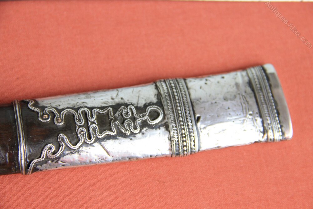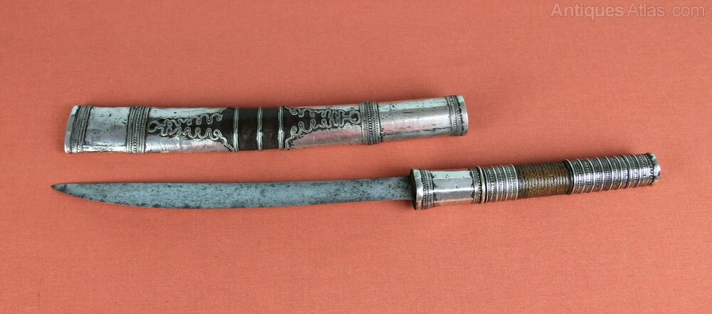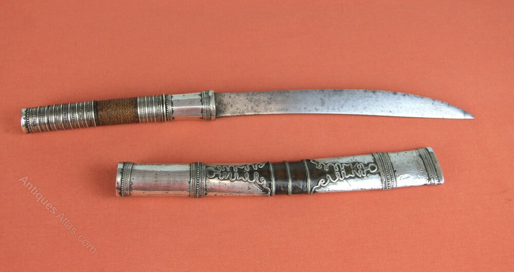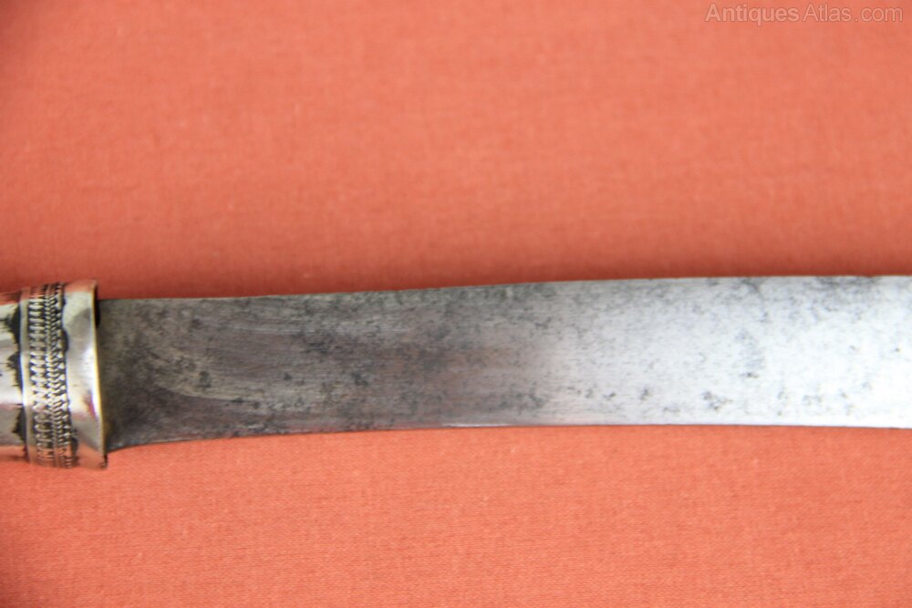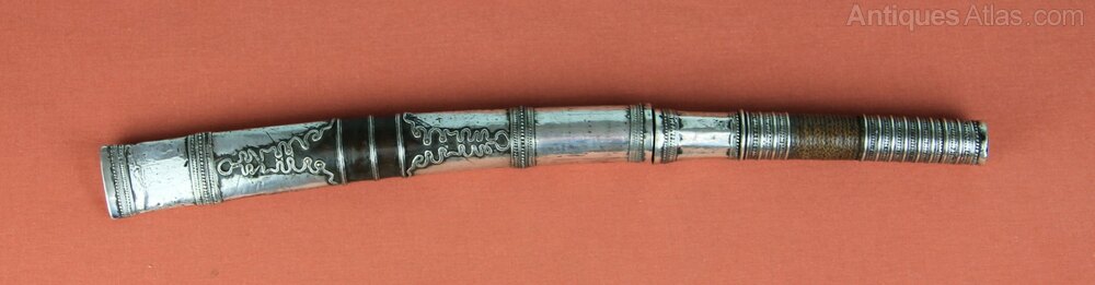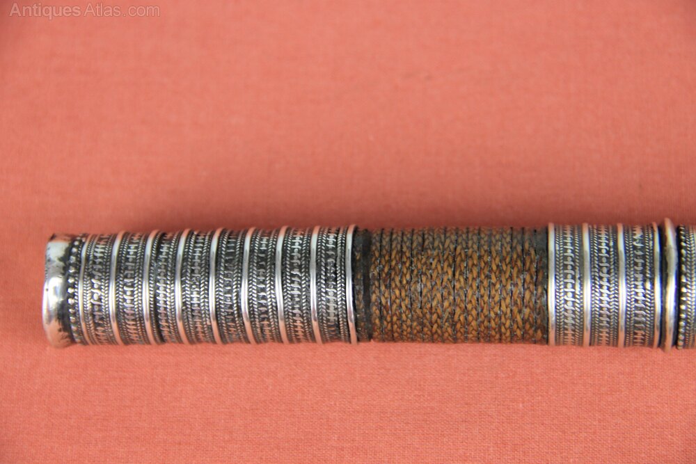 19th century Silver mounted Burmese Dha. It is mostly covered in sheet silver with decorative filagree mounts. Handle has a small area bound in rattan. Single edged, curved blade with some rust staining overall. In generally used condition overall and slight damage to silver work.