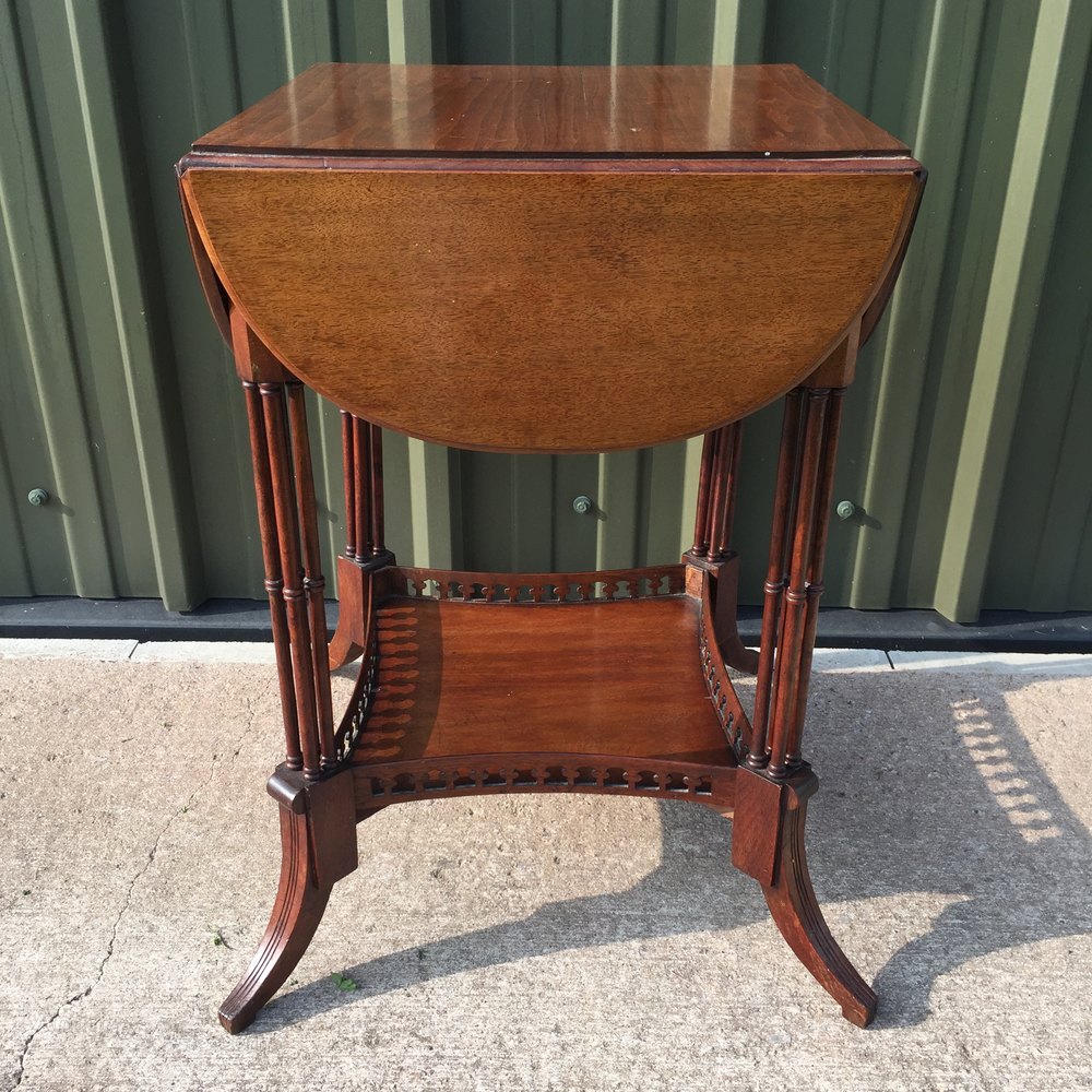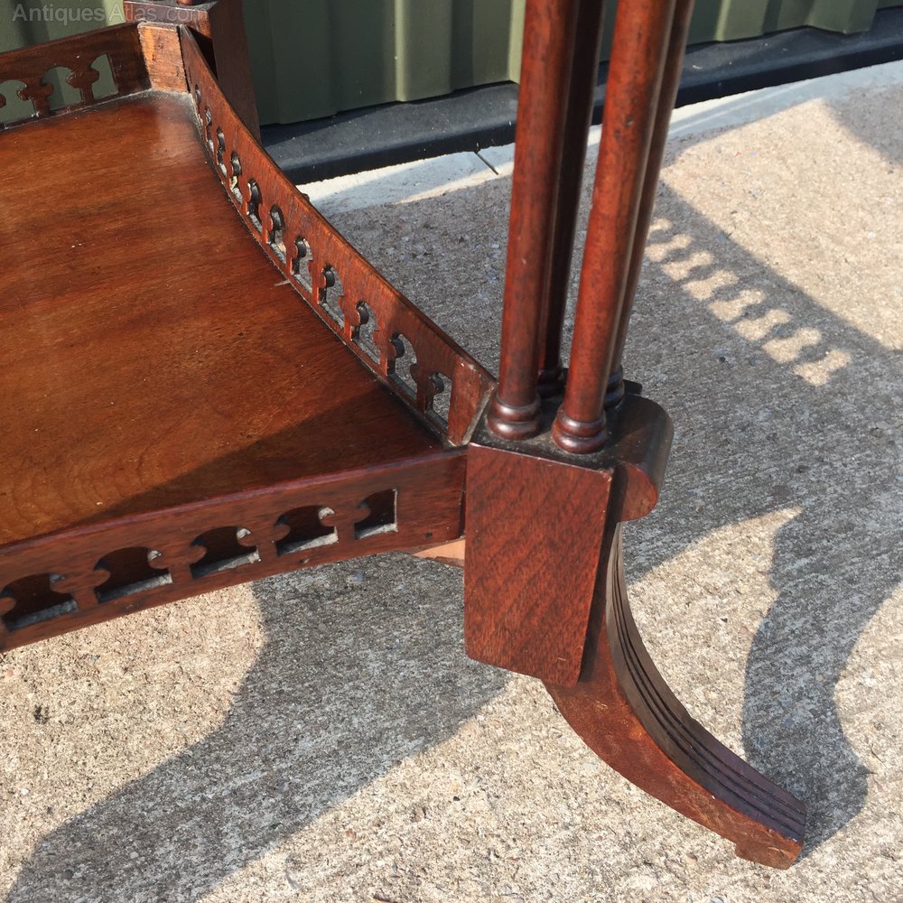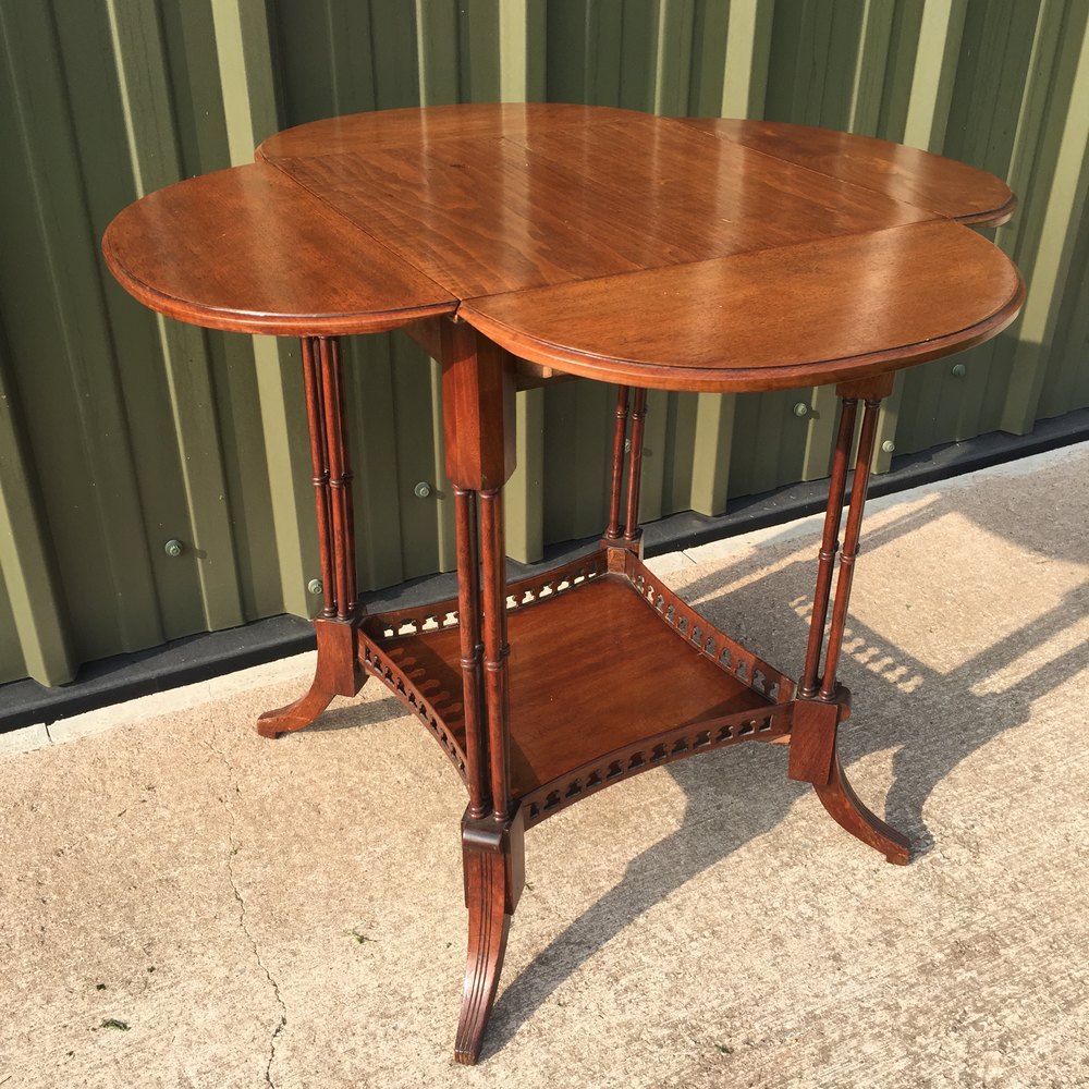 A good quality mahogany 4 flap occasional table on clustered column supports. Fretted gallery under tier. Original condition.