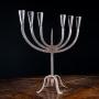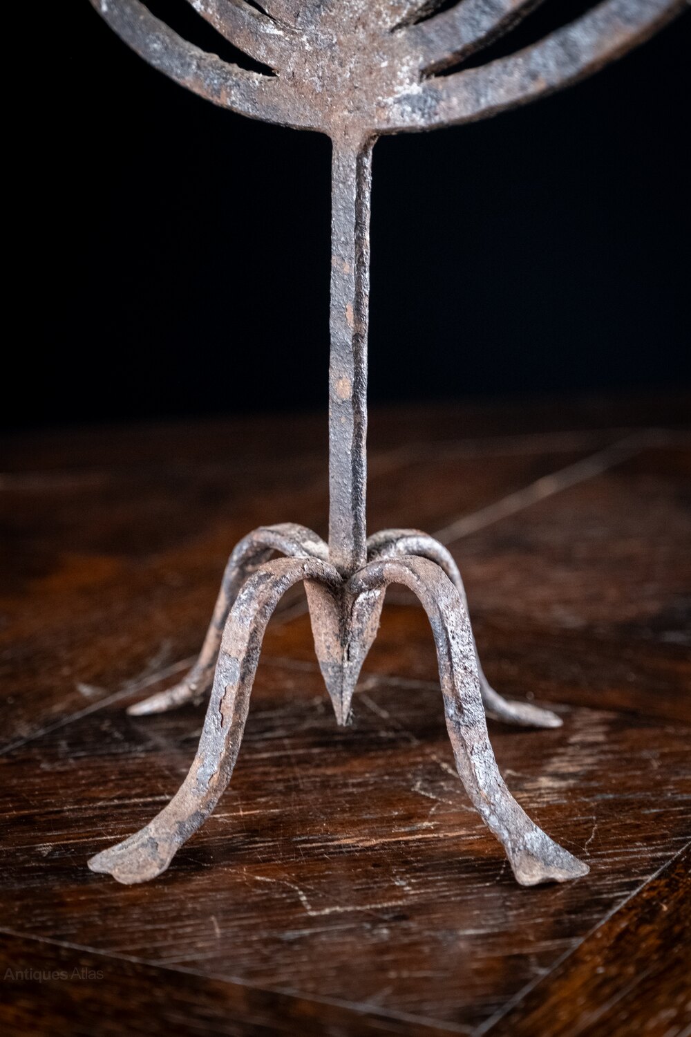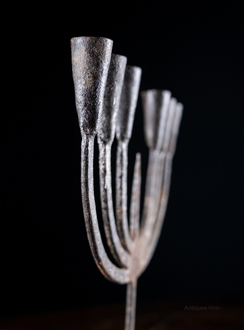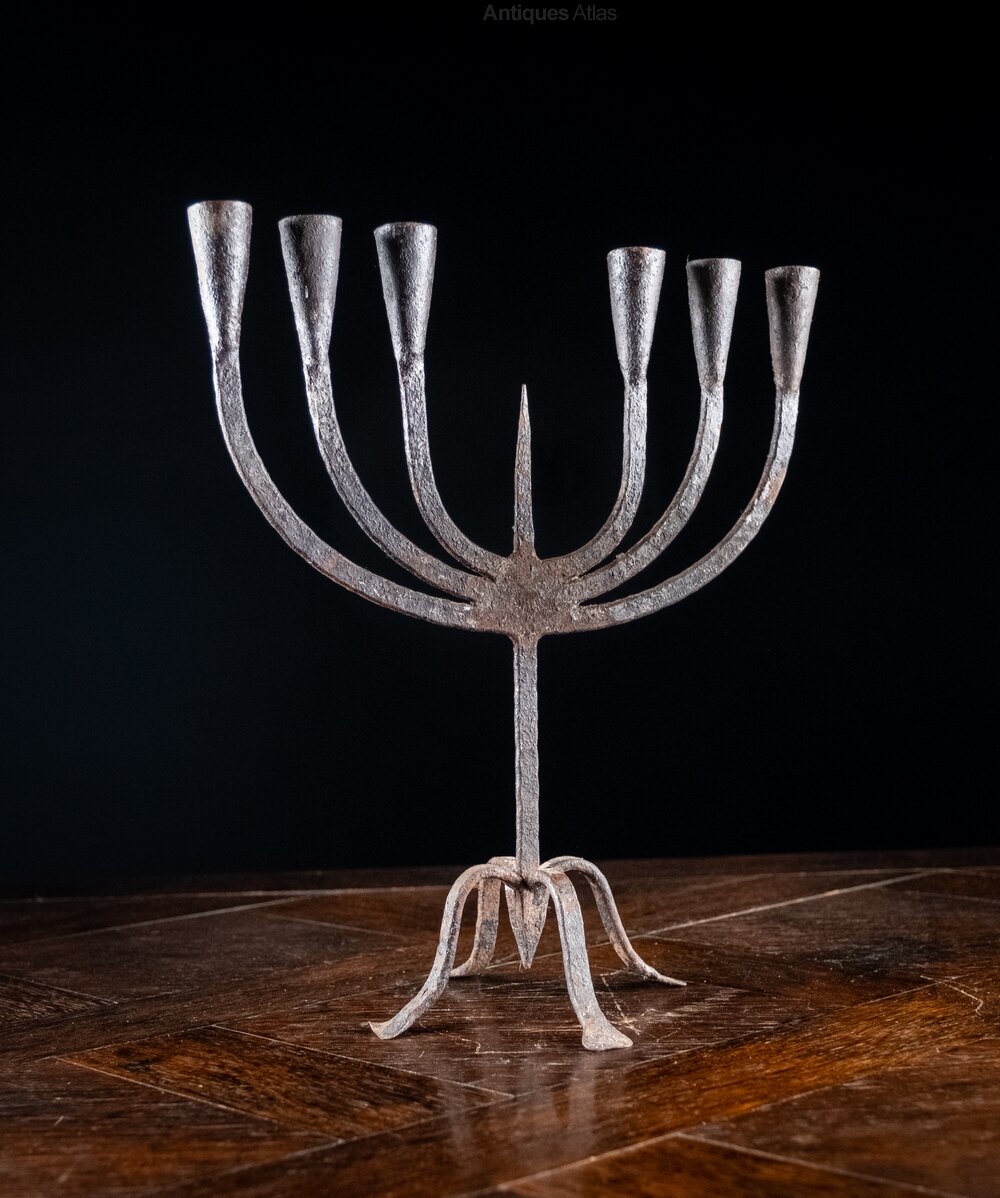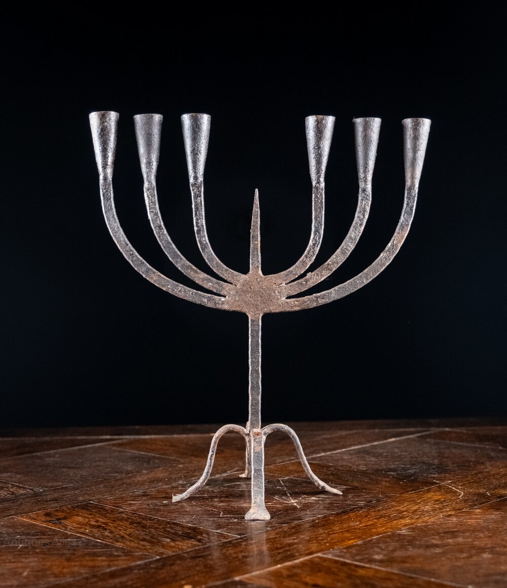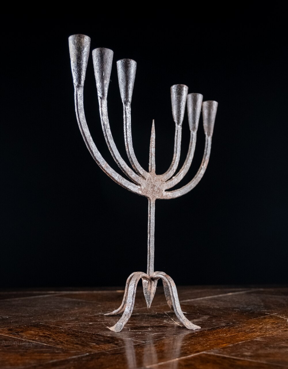 The six candle holders rise from flattened stems flanking a central spike with the whole raised upon four flared feet with a central spike to the base.