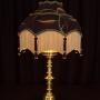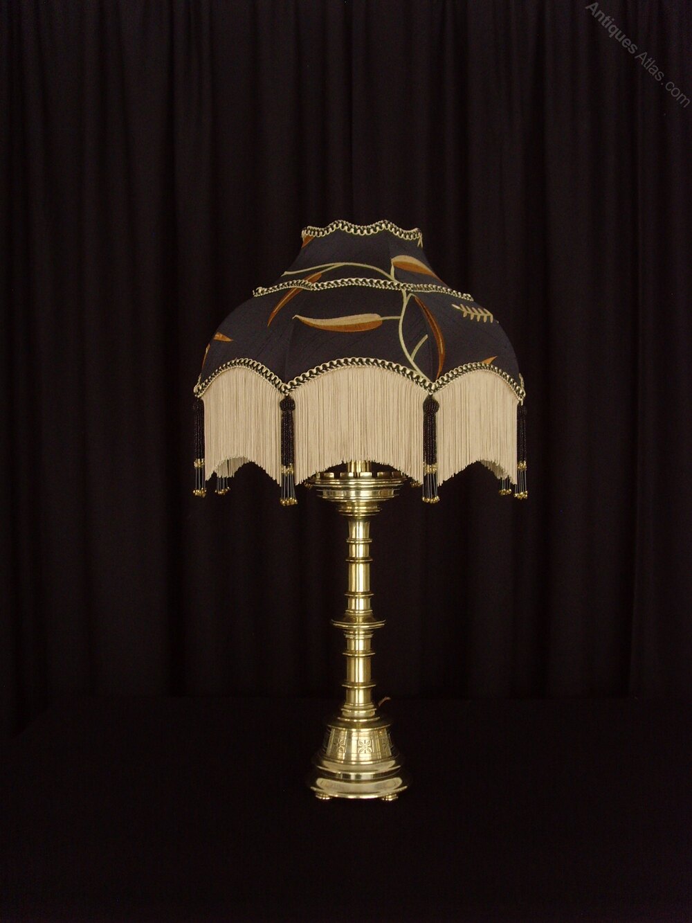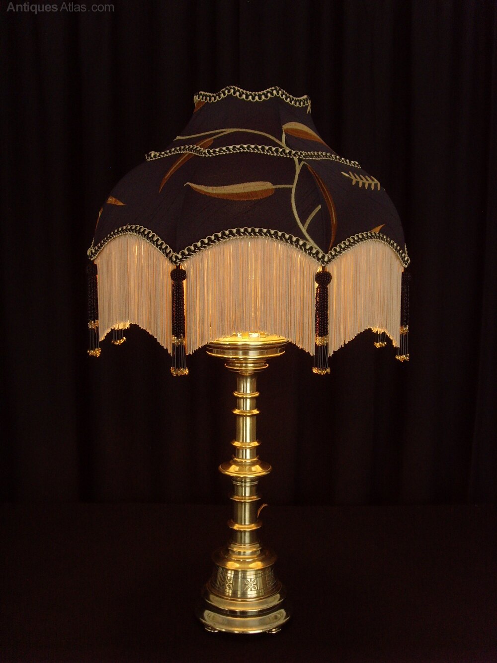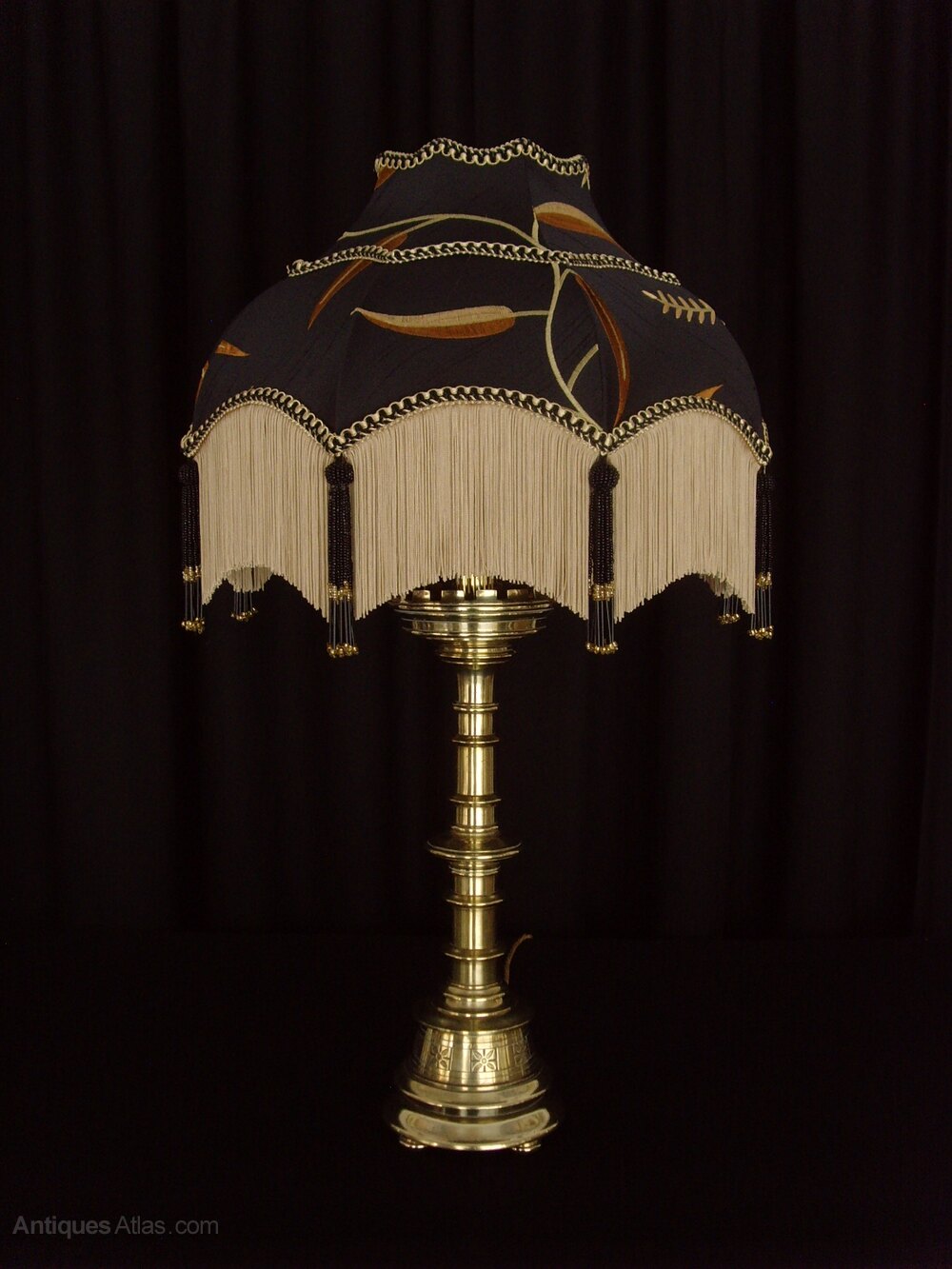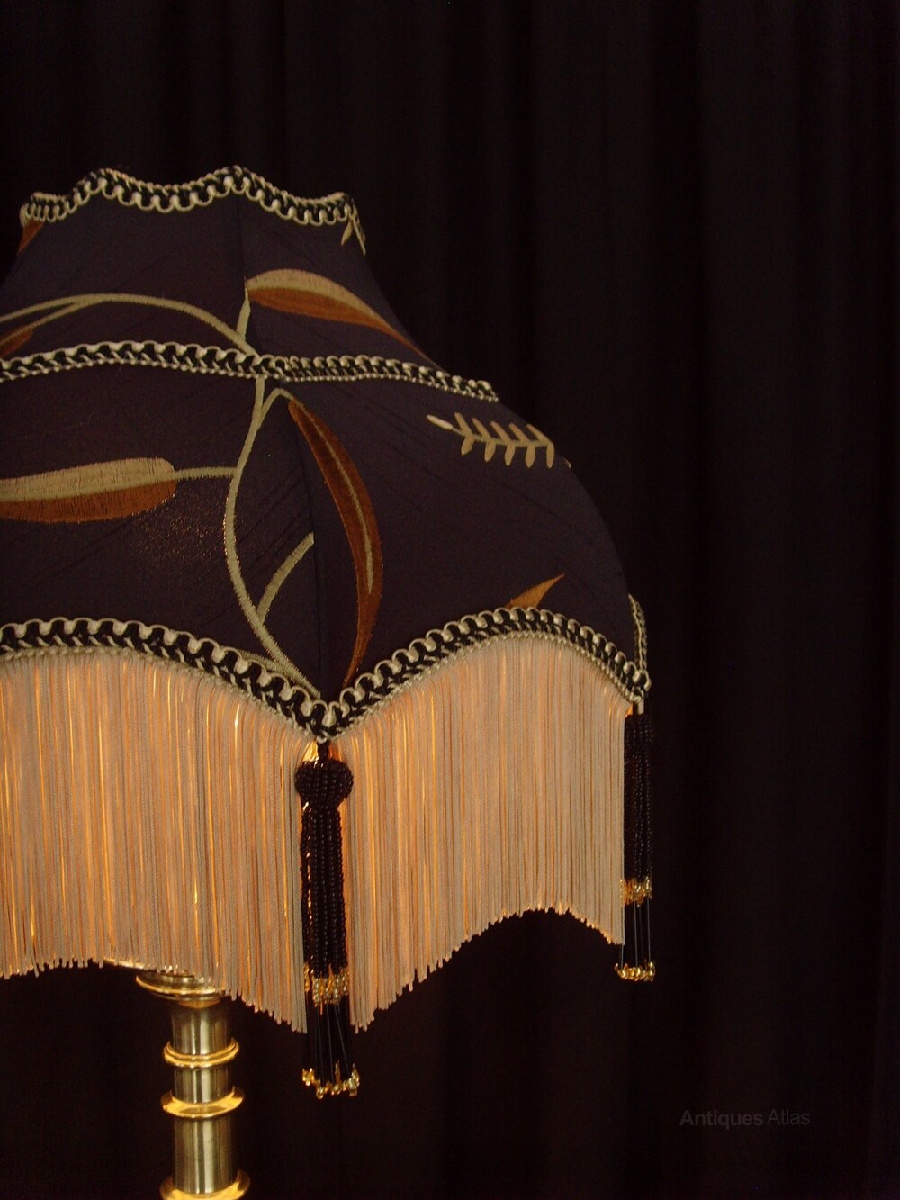 The shade is in the 'Maia' style and is made of Black Silk, embroidered with tendrils and leaves in gold and rust. It has a soft gold fringe, black and gold braid and black and gold beaded tassels.