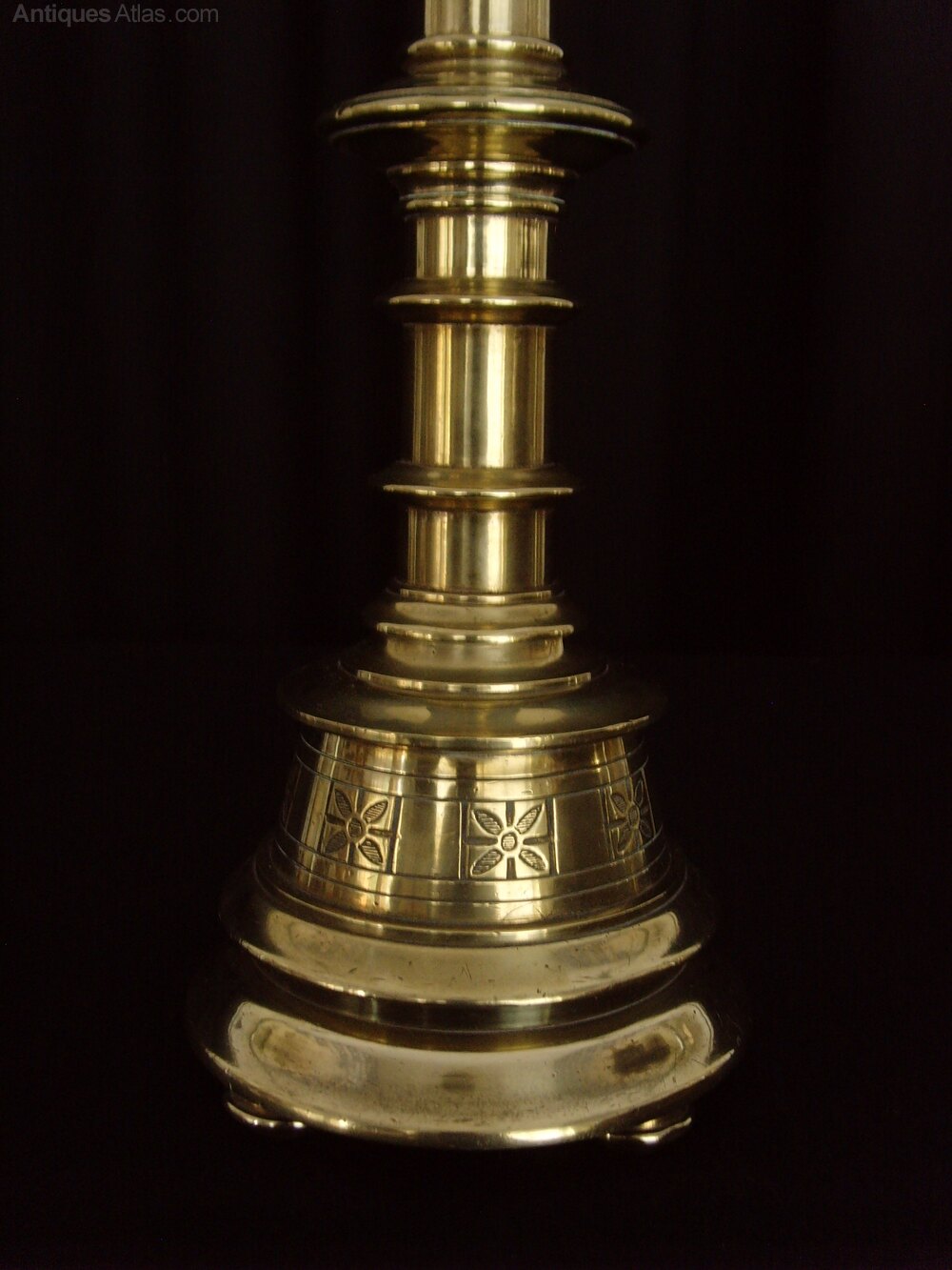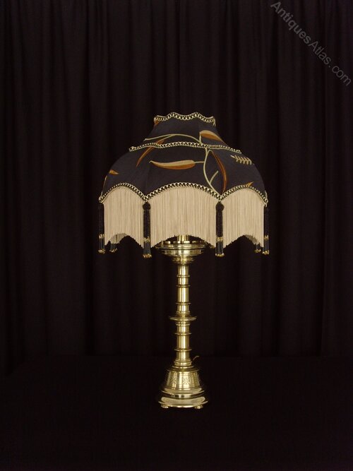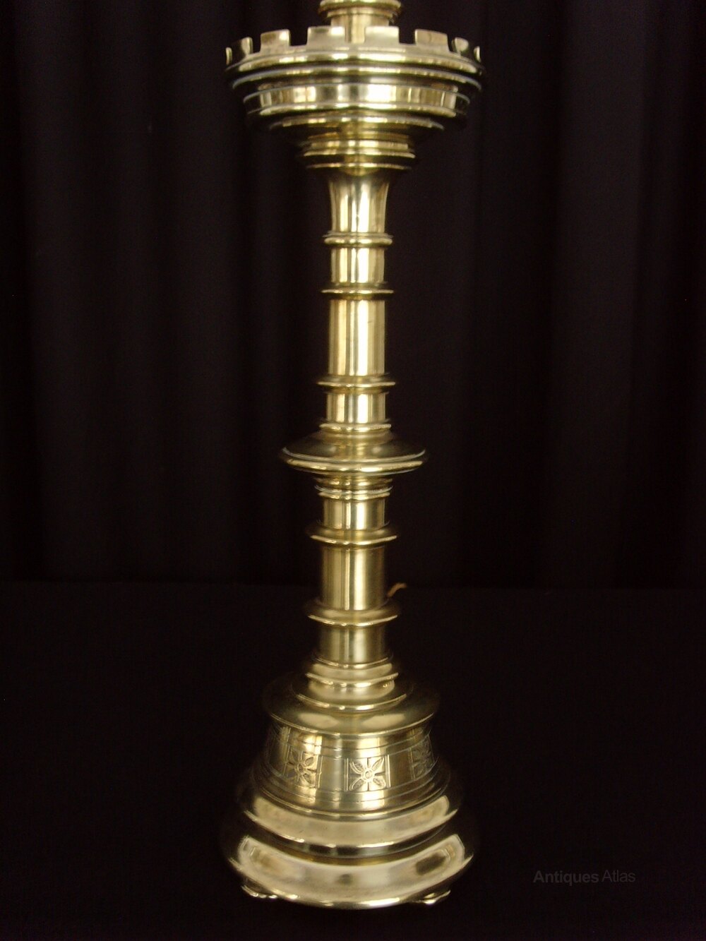 The Lamp stand on three circular brass feet and has a floral ornamented section running around the base. It has a multi turned column supporting a bowl with castellations and a candle sconce, in typical Gothic style and similar to candlesticks often found in an ecclesiastical setting, although with no religious piercings or patterns.