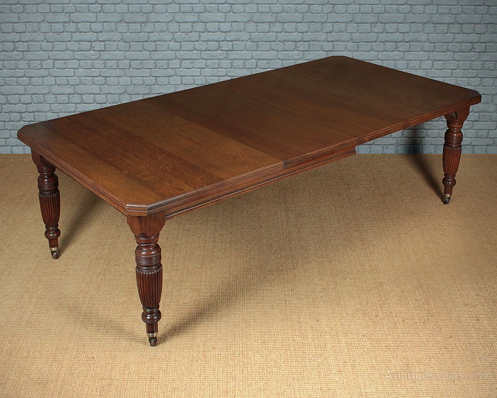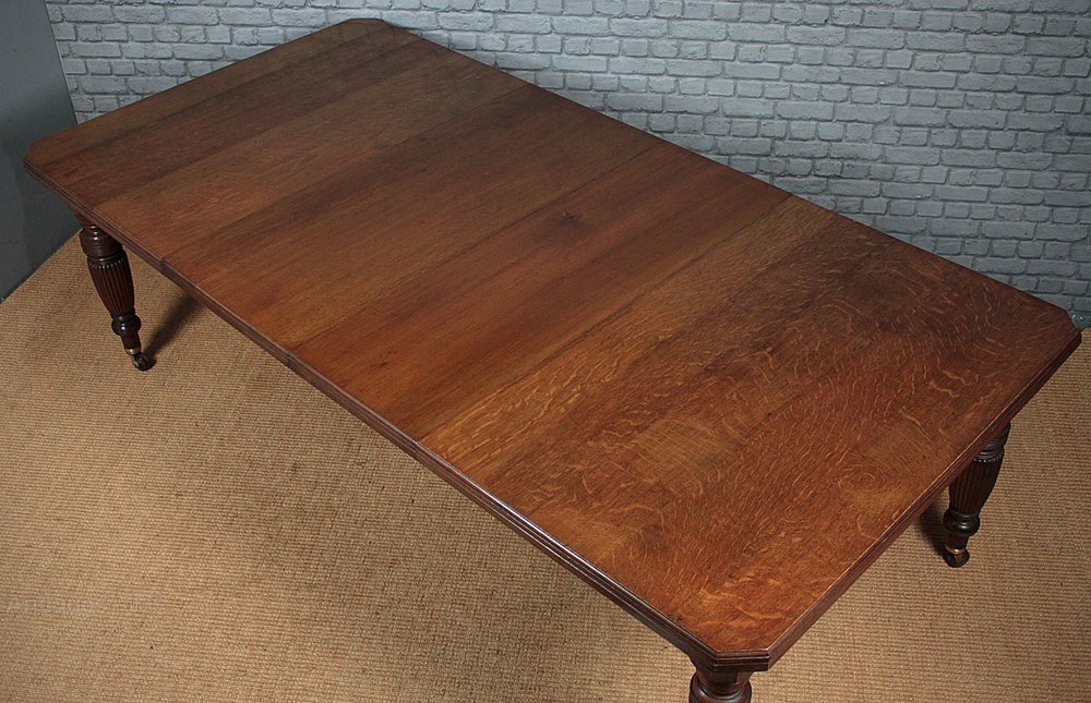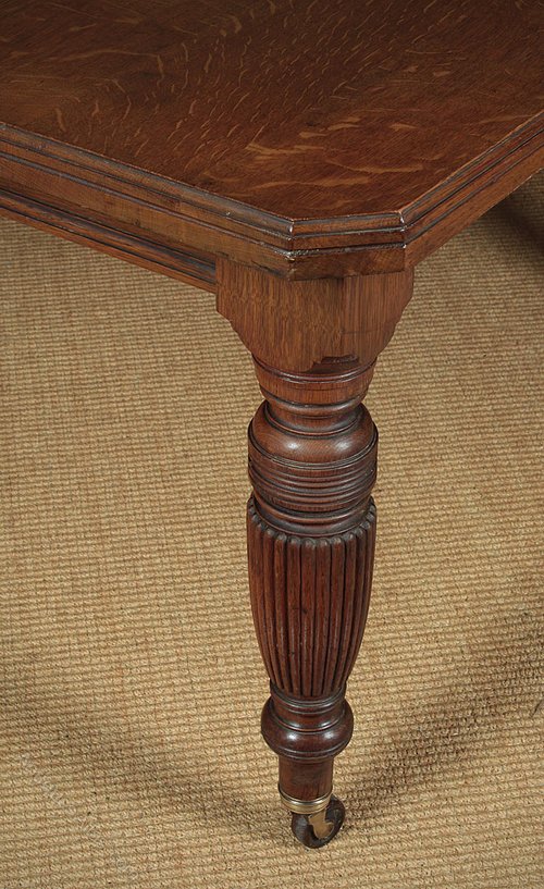 Late 19th.c. extending oak dining table c.1890. Extending on a corkscrew mechanism from 59″ to a maximum length of 94″ with two additional leaves to comfortably seat 10 people. Solid oak top with a moulded edge and canted corners on good turned and reeded legs with the original brass collared pot castors. Excellent colour and condition, cleaned and polished in our workshops. Winding handle supplied.