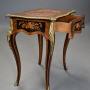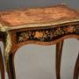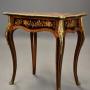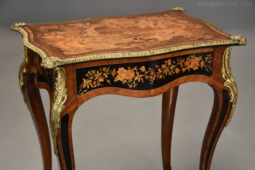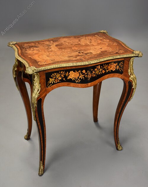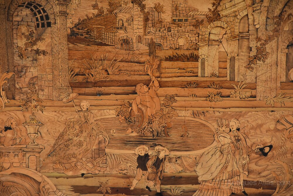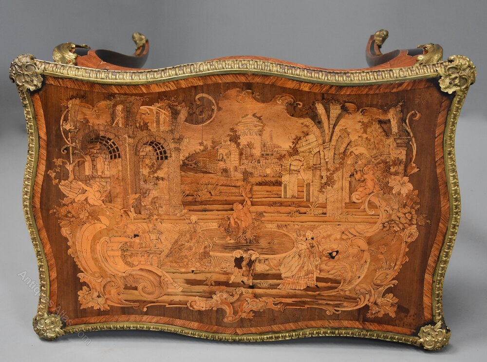 This table consists of a shaped top with extremely fine quality marquetry decoration of exotic woods, the top consisting of a central inlaid panel depicting a Classical scene of noblemen and women strolling in a landscape with a Chateau and fountain to the centre, all surrounded by a shaped Kingwood crossbanding with applied outer ormolu moulding with mounts to each corner.