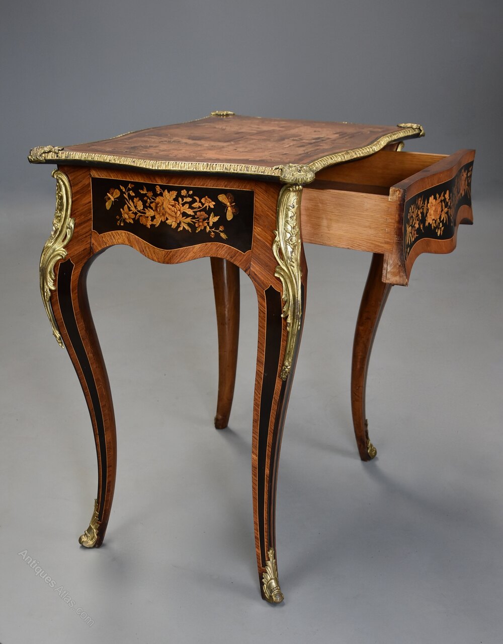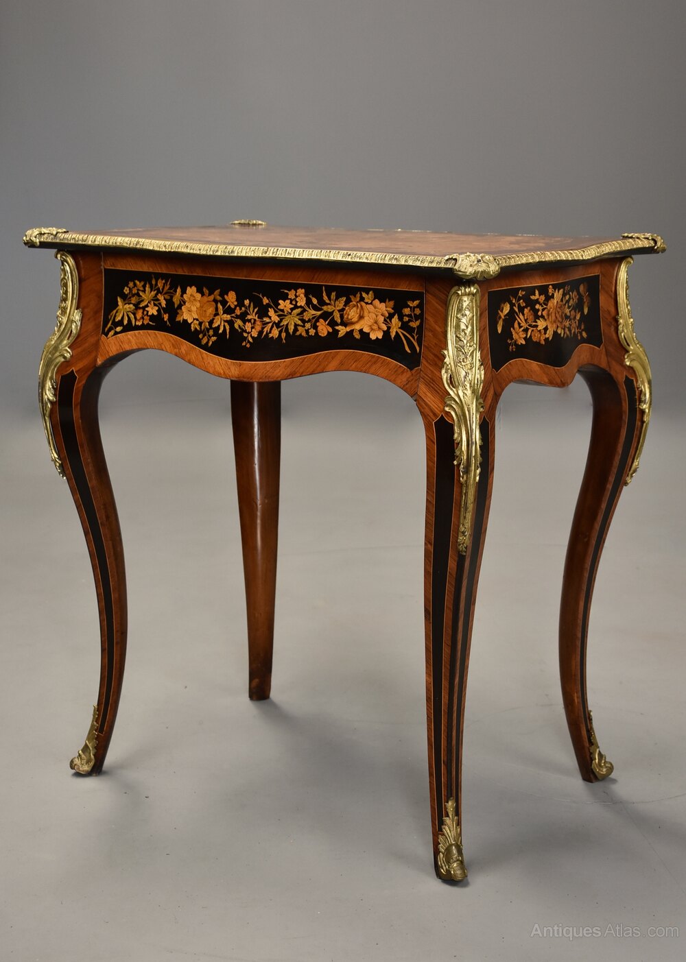 The table is supported by four elegant cabriole legs consisting of ebony, boxwood stringing and Kingwood banding all with applied ormolu mounts to the top, terminating with ormolu sabots.