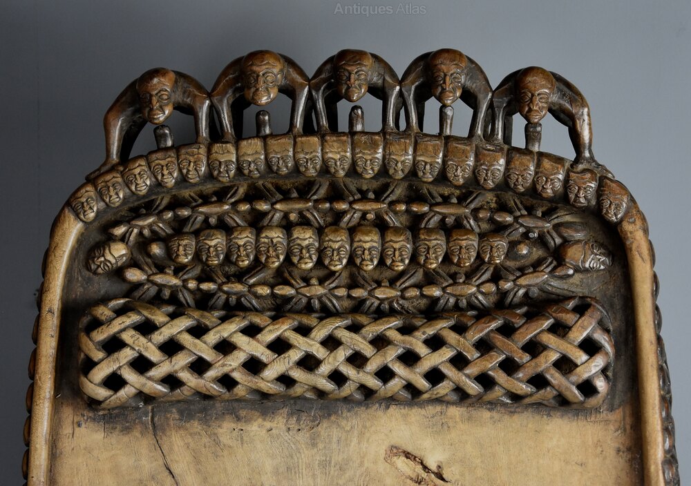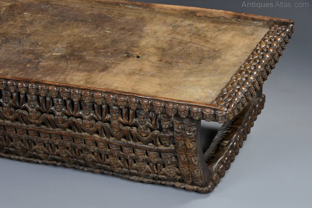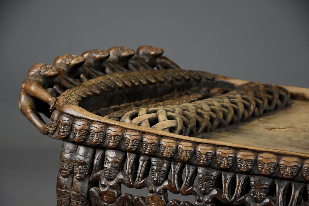 The sides profusely carved and pierced with faces and stylised figures with a border of small faces to the base, the faces and figures symbolising ancestors, warriors and spirits.