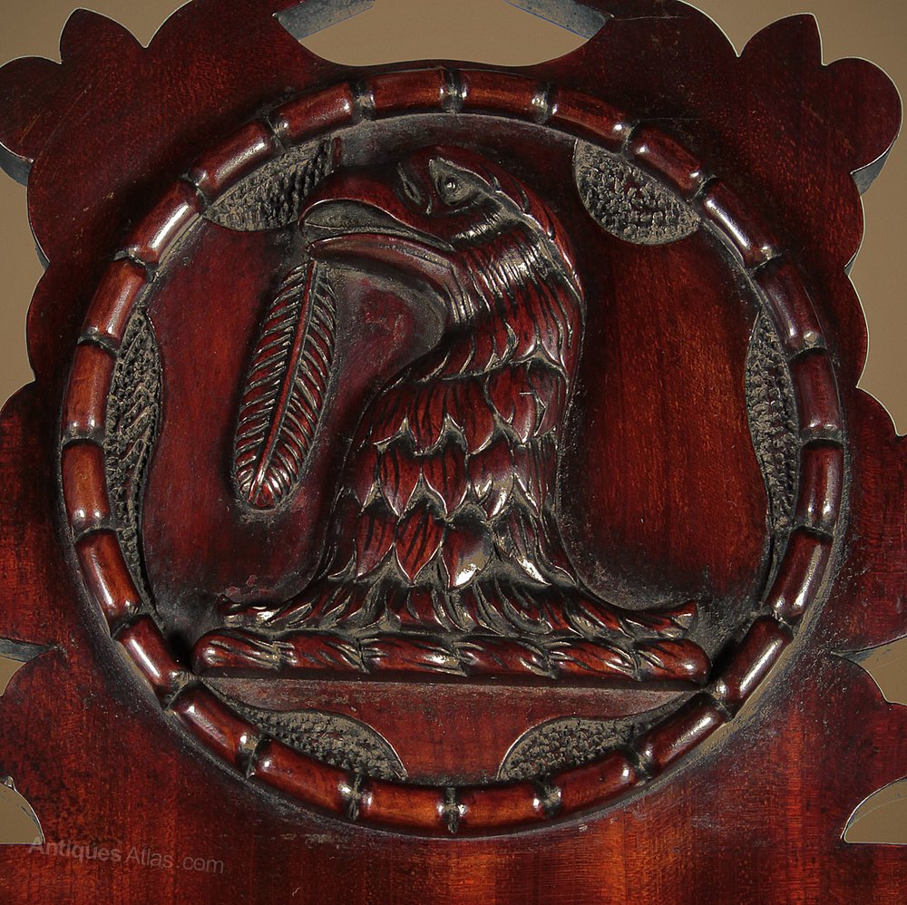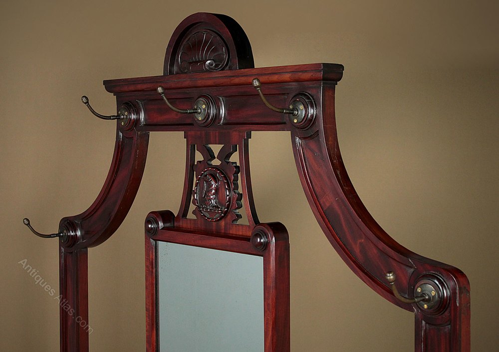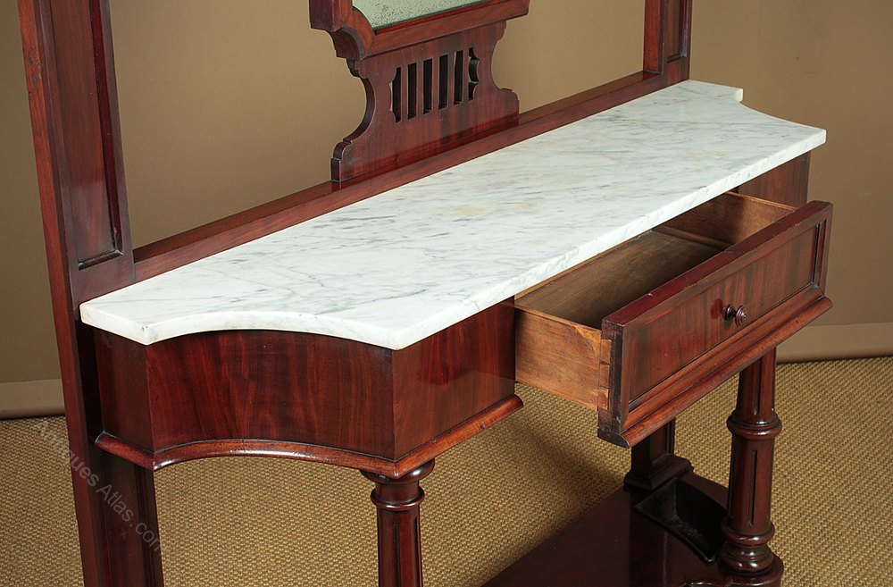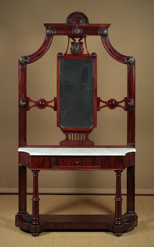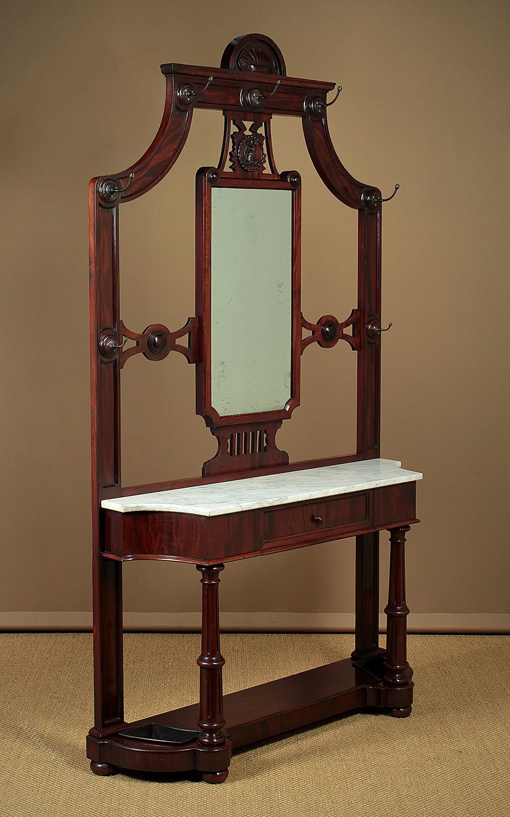 Impressive mid 19th.c. mahogany hall stand with mirror and table c.1850. Standing 89″ tall with seven hooks aranged around a central mirror over a shaped white marble table top table with a single glove drawer below. Raised on turned coloumn front legs jointed with shaped plinth base with metal drip trays. Carved and pireced frame with turned roundels and flame mahogany veneers onto mahogany groundwork. Carved above the mirror with an heraldic device of an eagle’s head with a feather in its beak. Some repairs and restorations to the top of the frame and tarnish to the mirror. Generally very good colour and condition.