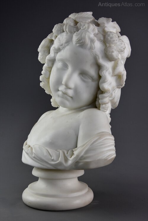 This marble bust consisting of a young girl with her head to the side with leaves and flowers in her hair, signed ‘Houdon’ to rear shoulder, supported on a circular base.