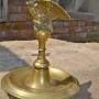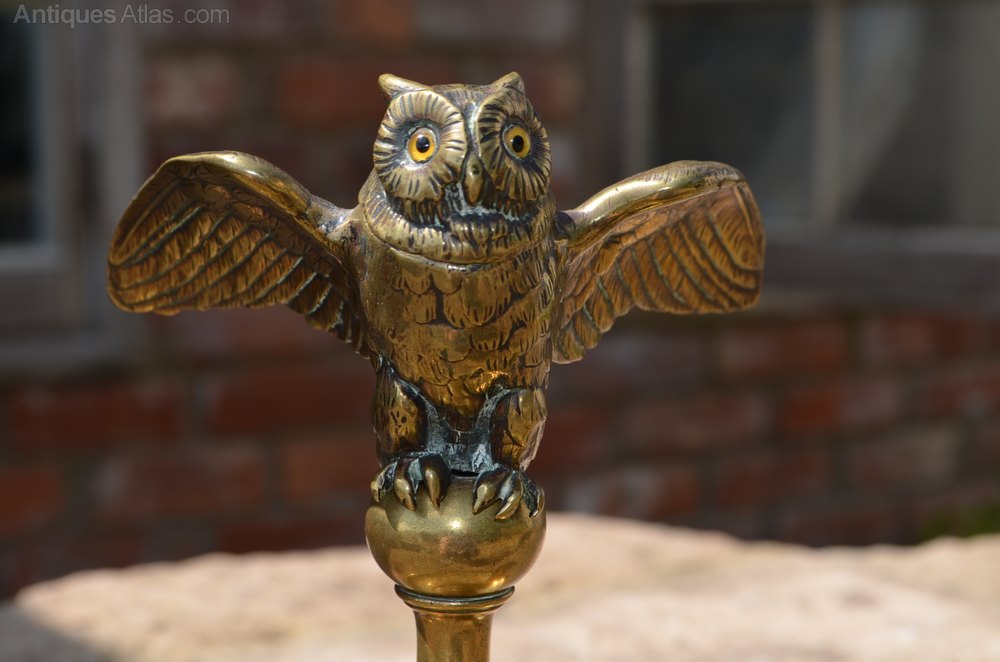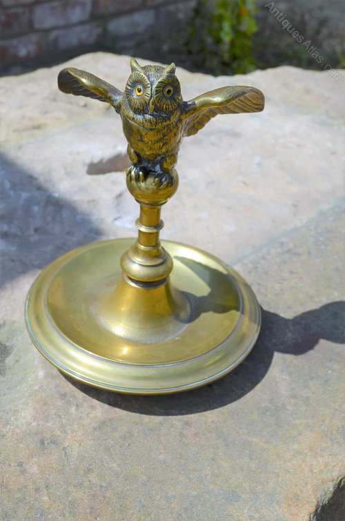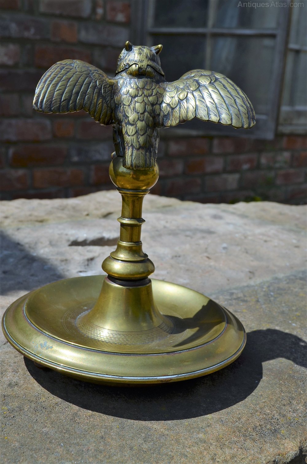 An unusual 19thc bronze and brass, desk or table match safe / vesta in the form of an owl, with glass eyes, perched with open wings on a pedestal surmounting a dish on bun type feet. No visible markings. Head is hinged and lifts to reveal a compartment for matches.
