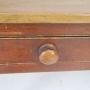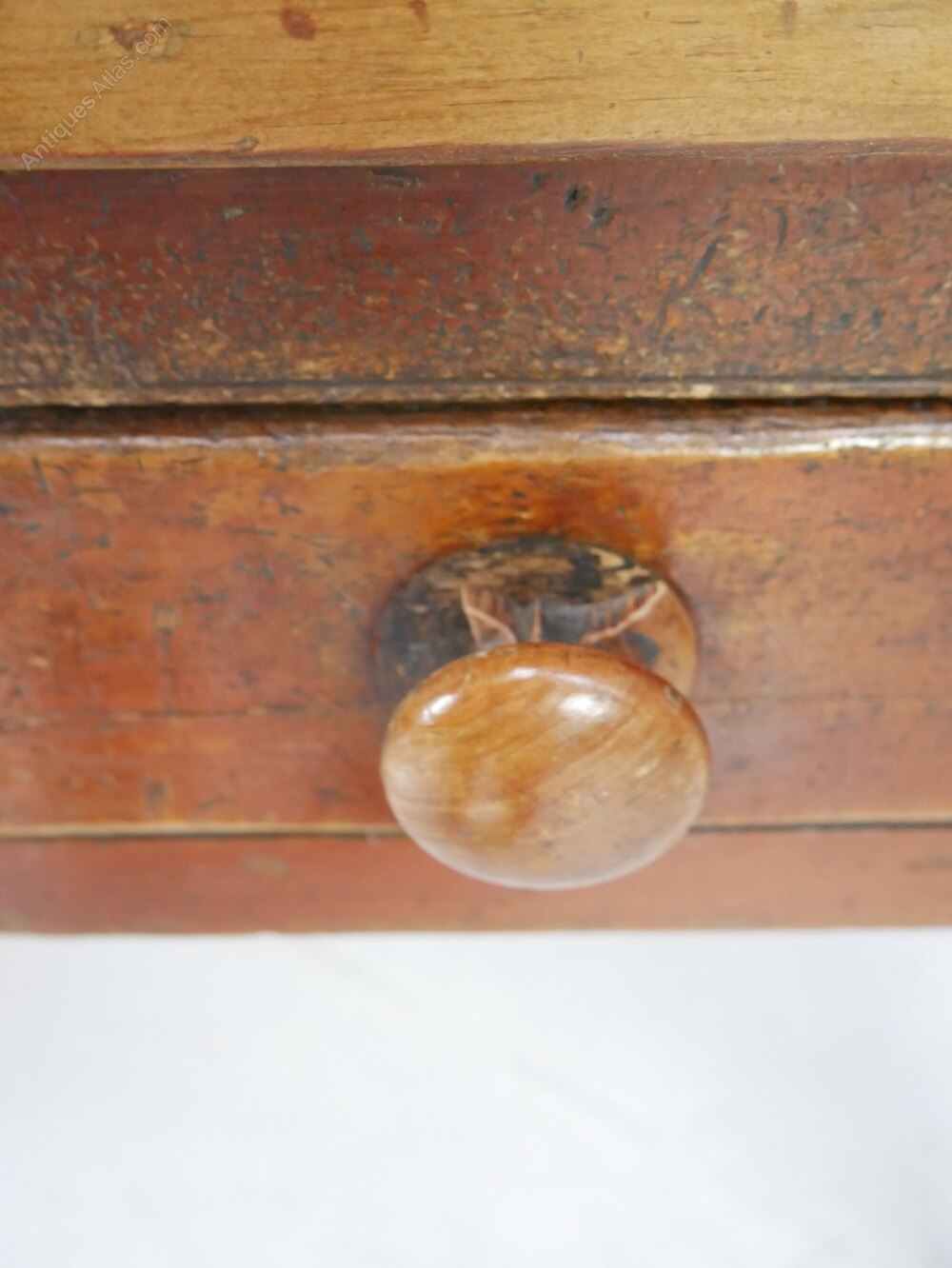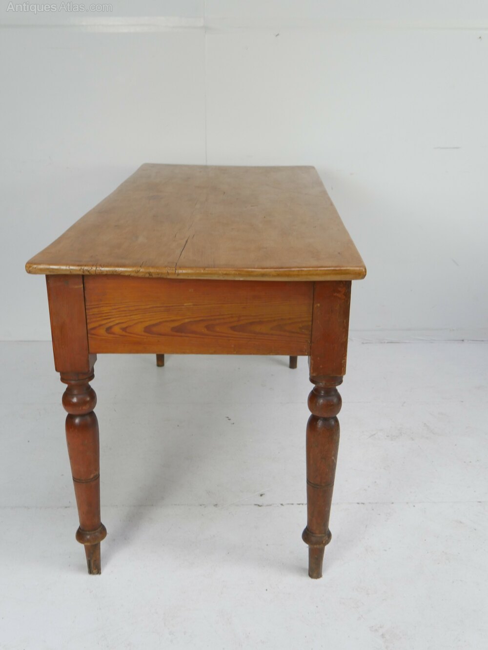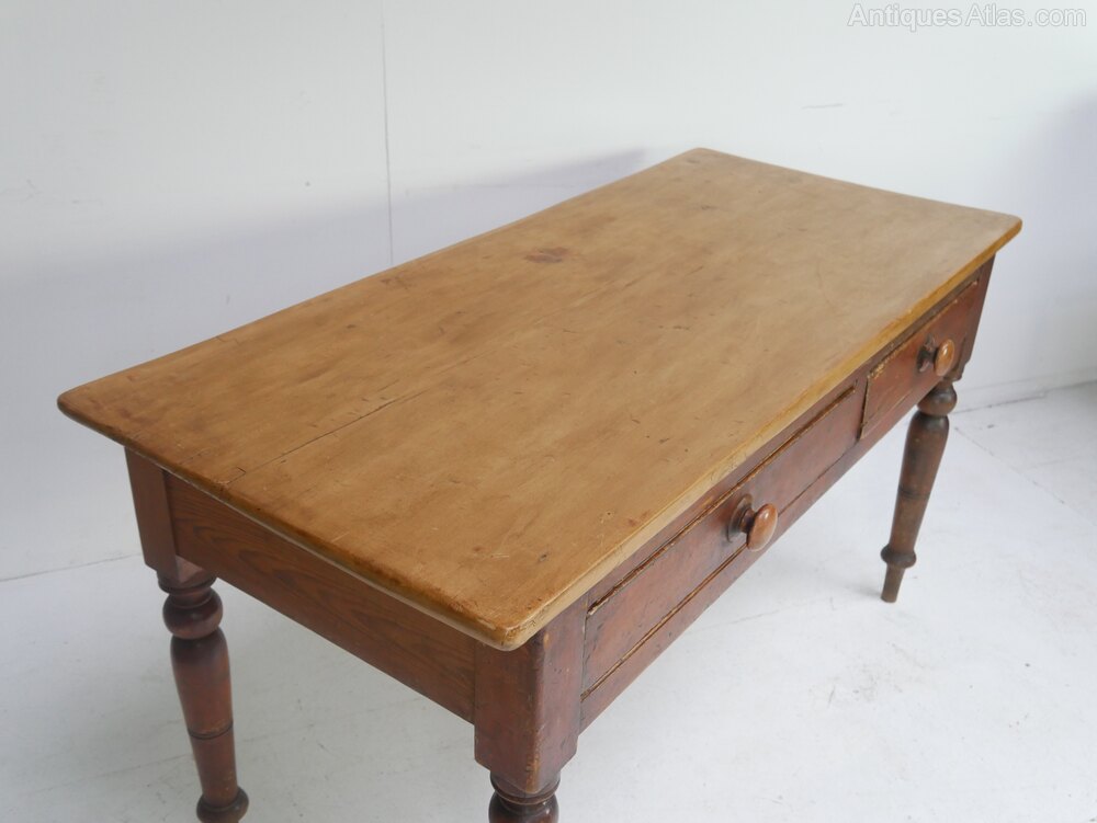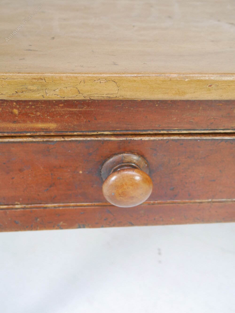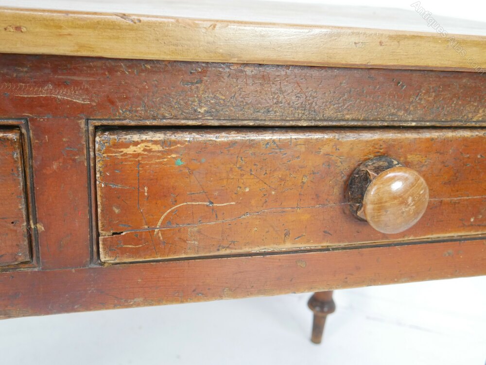 A 19th century original pine table with a wide drawer to the left and a smaller drawer to the right, wooden knob handles, painted base, standing on turned legs. The table is in strong condition, good running drawers, old repair to a front drawer see photo, the table is a lovely warm colour and all ready for use.