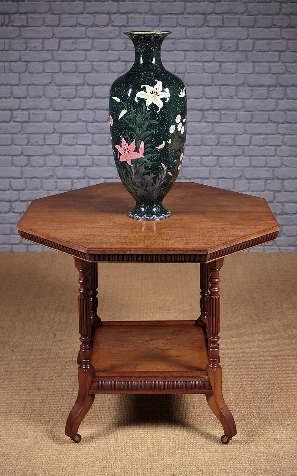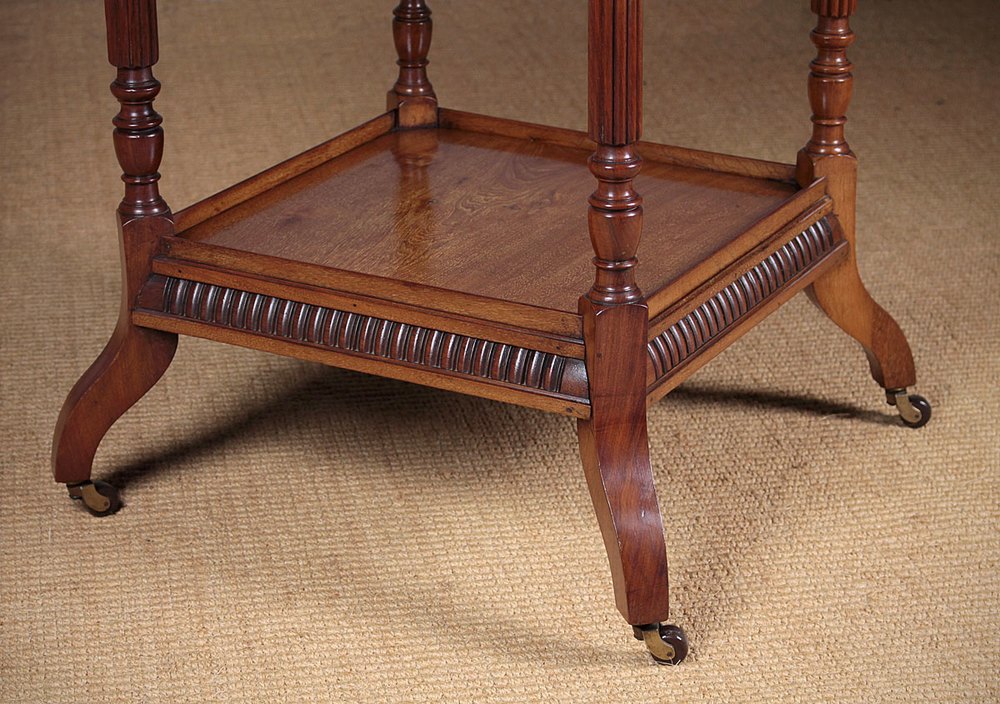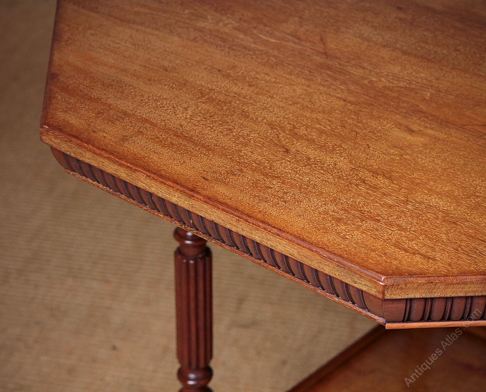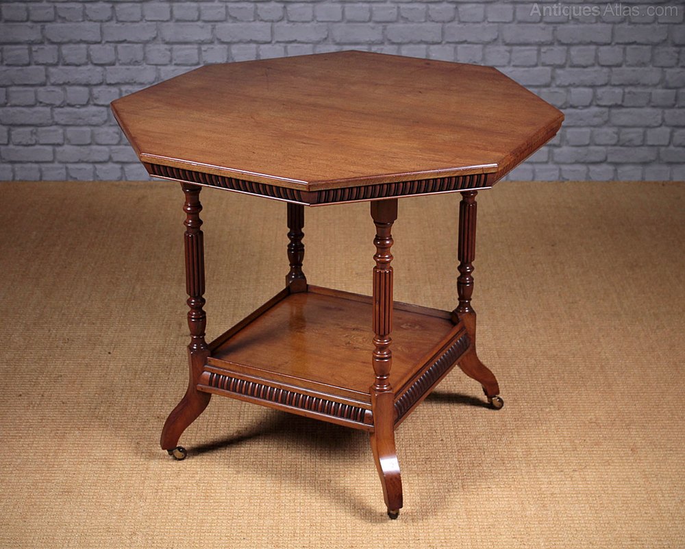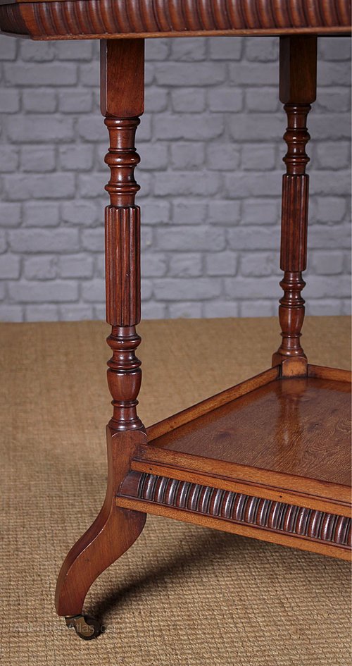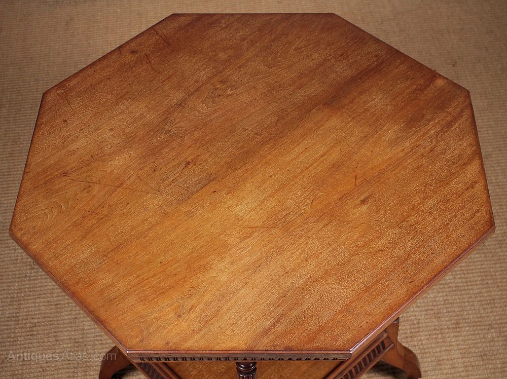 Very smart late 19th.c. walnut window or centre table c.1890. Solid walnut throughout. Octagonal top with a moulded edge over a gadroon carved apron. Raised on turned and reeded legs joined with a square stretcher shelf with a raised lip, also gadrooned below. On swept feet with original brass and ceramic castors. Excellent condition, cleaned and waxed in our workshops.