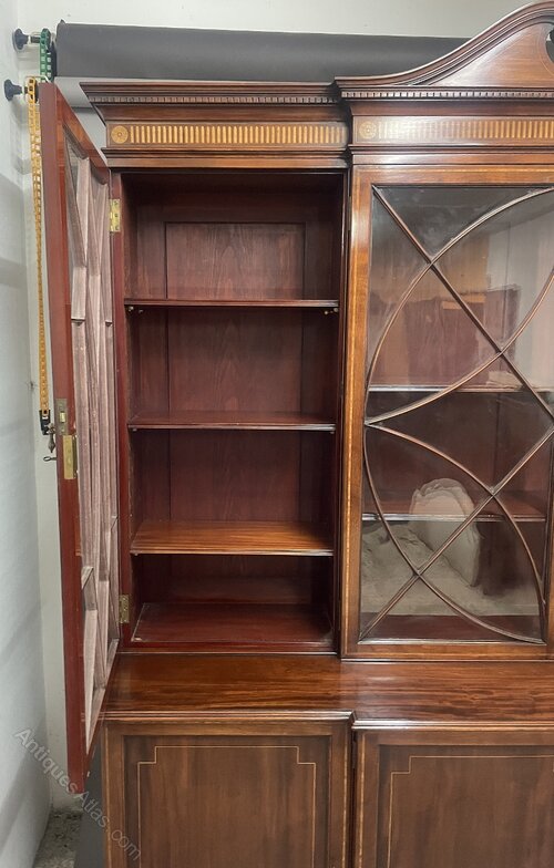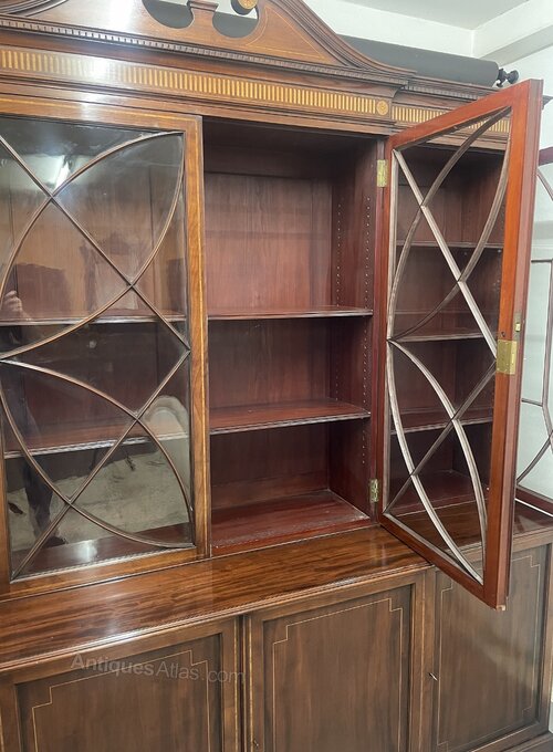 A fabulous quality 19th Century inlaid mahogany breakfront bookcase, having a moulded edge cornice with dentil moulding and a swan neck pediment at the centre with decorative circular fan inlays, the frieze below having further decorative inlay, having four astrigal glazed doors below opening to reveal three adjustable shelves at the sides and two adjustable shelves at the centre, the bottom section having four inlaid panelled doors opening to reveal two adjustable shelves in each section, supported on a plinth base. The bookcase is in excellent condition and having a nice warm rich mahogany colour. Circa 1880.