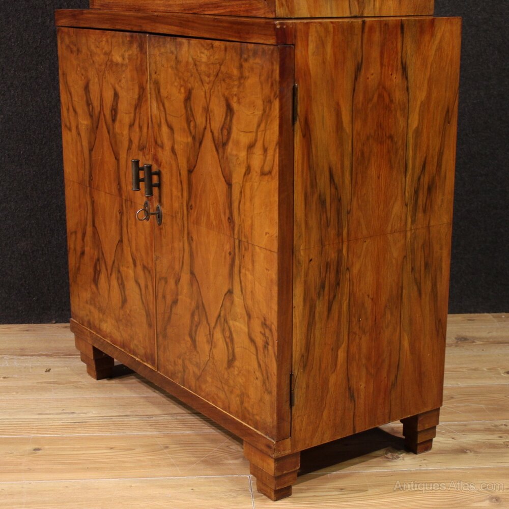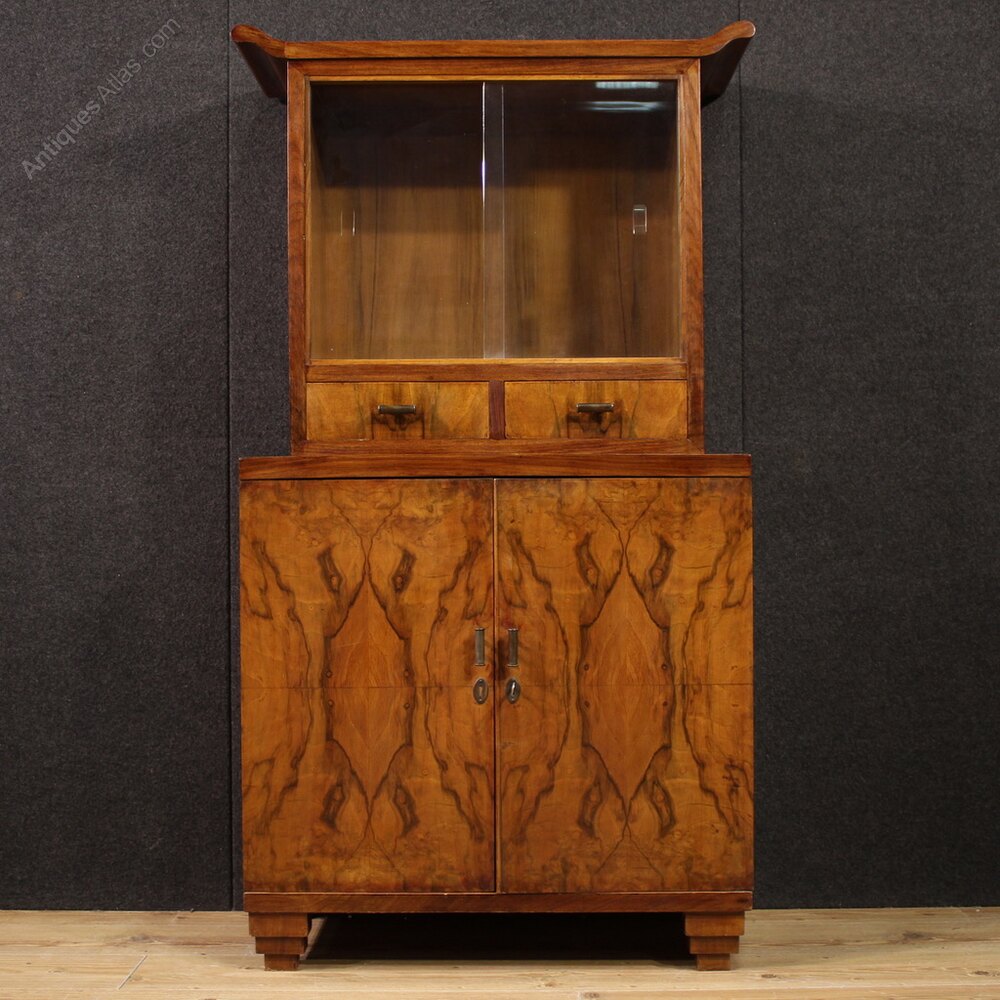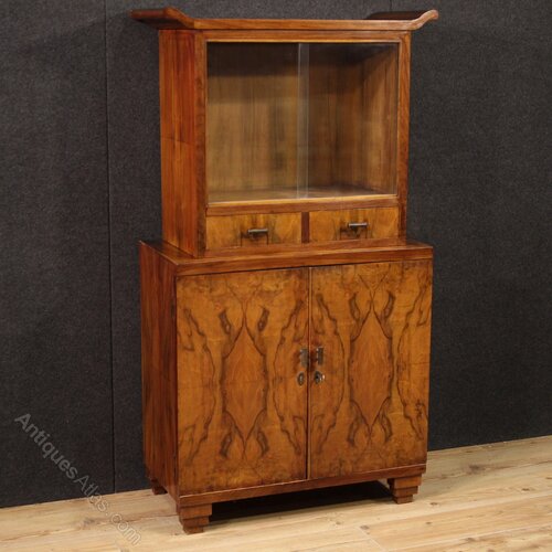 Mid-20th-century Italian display cabinet. Art Deco-style furniture veneered in walnut, burl walnut, mahogany, and fruitwood, of beautiful lines and attractive furnishings. The double-body cabinet features two lower doors, an internal shelf, and a generously sized base.