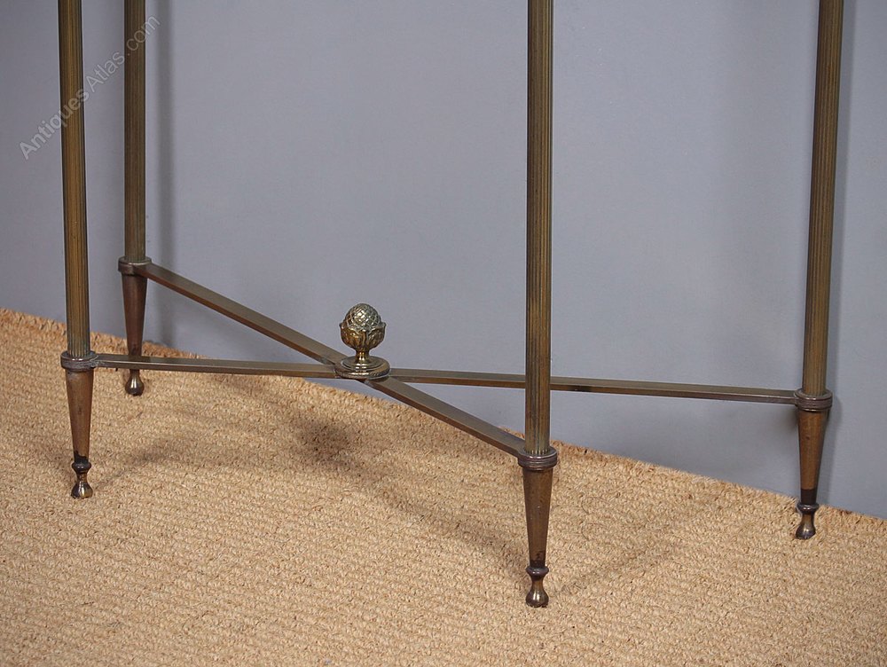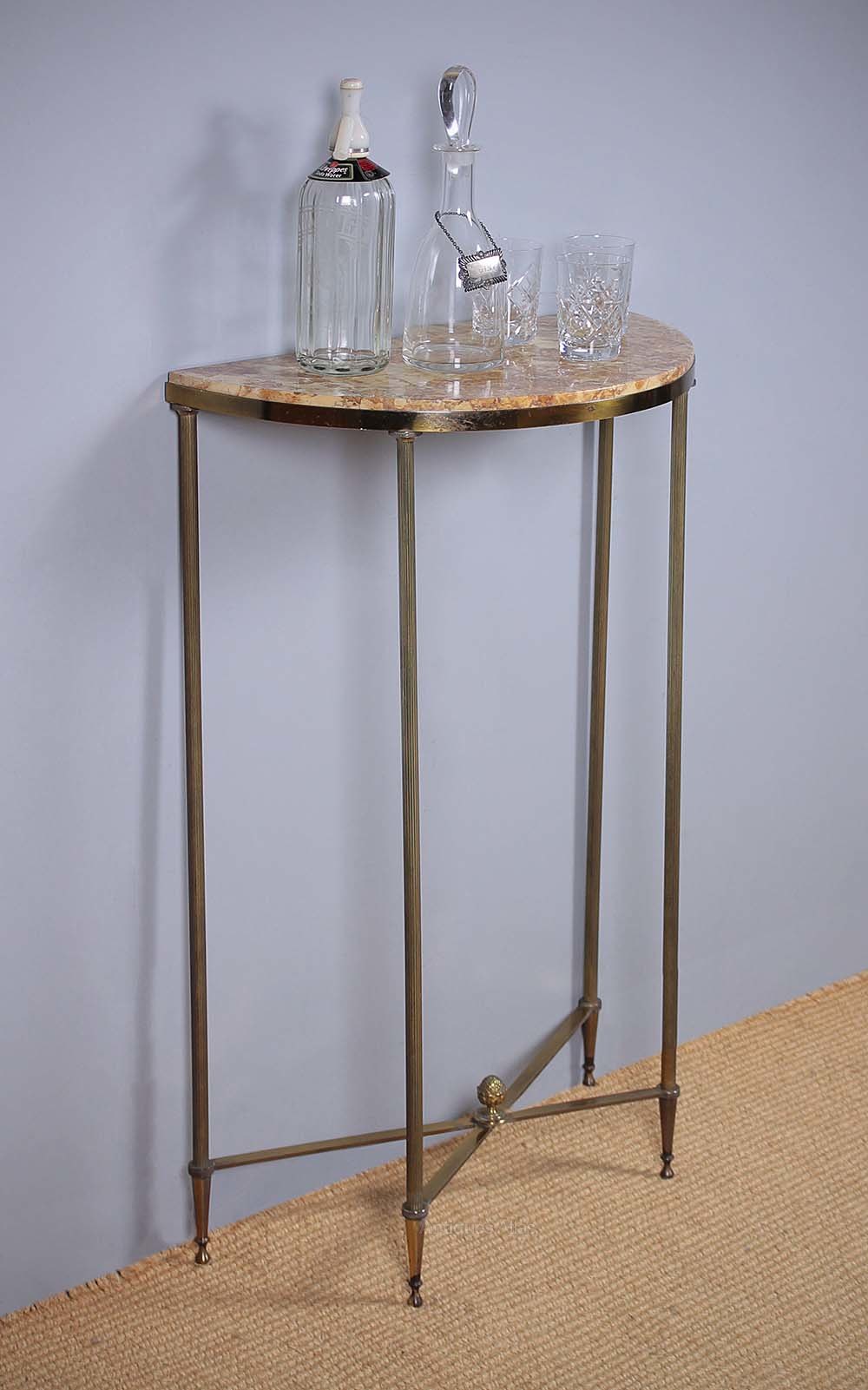 Elegant mid 20th.c. French marble and brass console table c.1950. Demi-lune top in a well figured, sand coloured marble. On long slim reeded column legs, joined with crossed stretchers with a good pommel at the centre point, and ending in tapering and turned feet. Very good original condition.