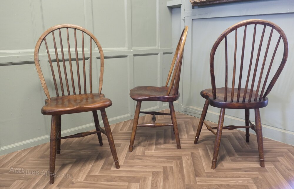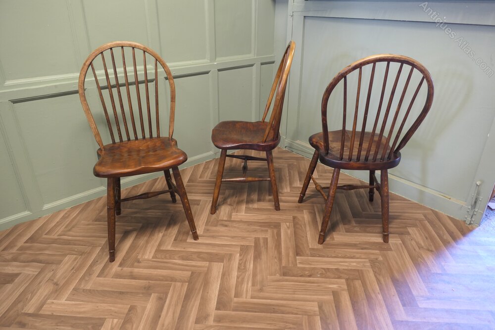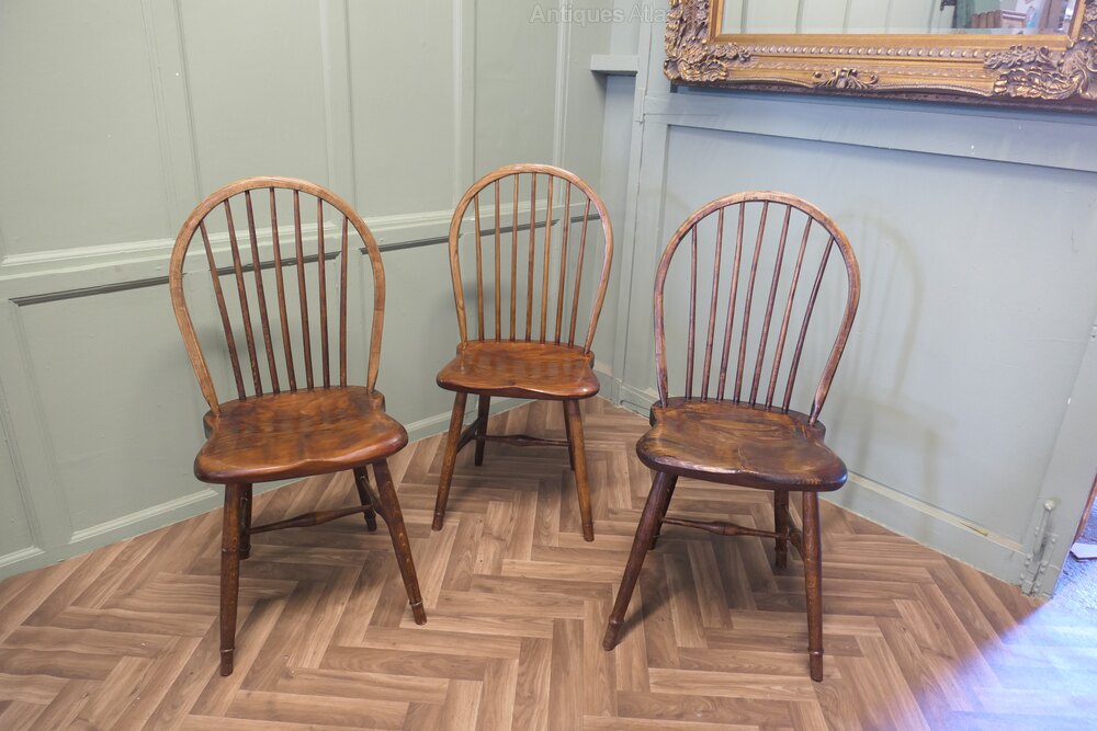 A superb trio of chairs these have been hand made in Oak and pine, the chunky saddle seats are very comfortable, they are hooped stick backs and they are approximately 38” high at the back, 18” wide and 18” deep, the seat height is 19”
