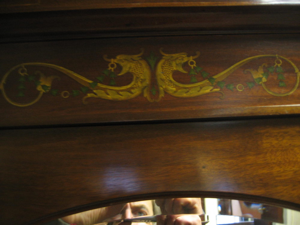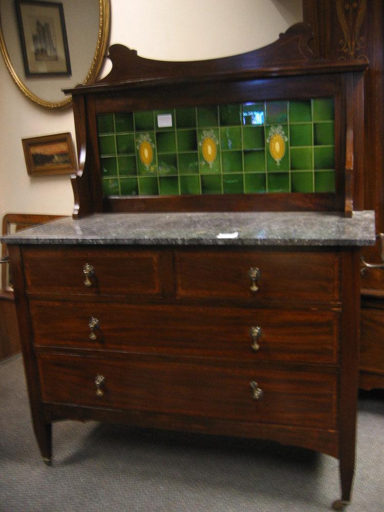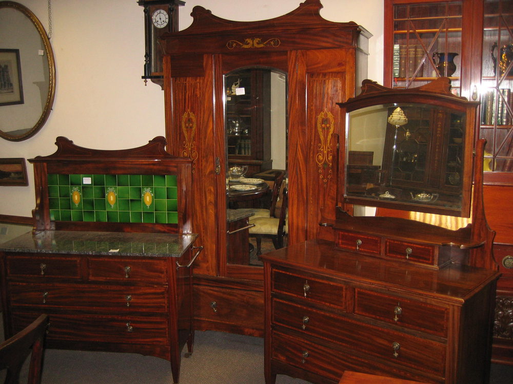 Edwardian mahogany inlaid bedroom suite of marble topped washstand,dressing table and mirror door wardrobe.Please note the dolphins are original stencils not inlay.