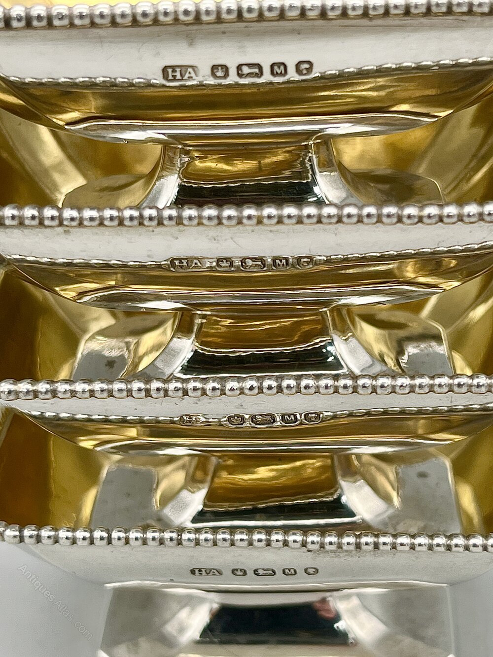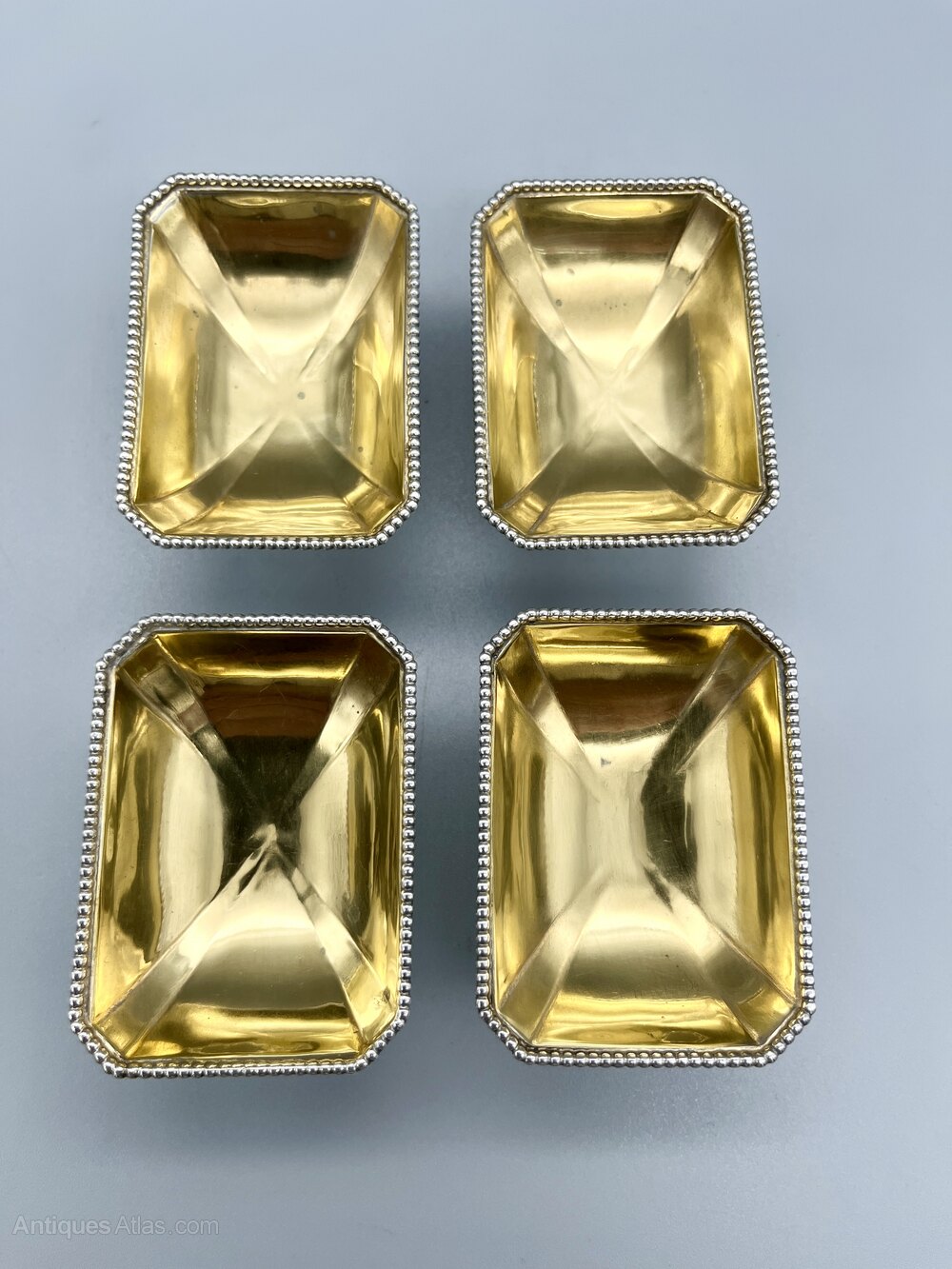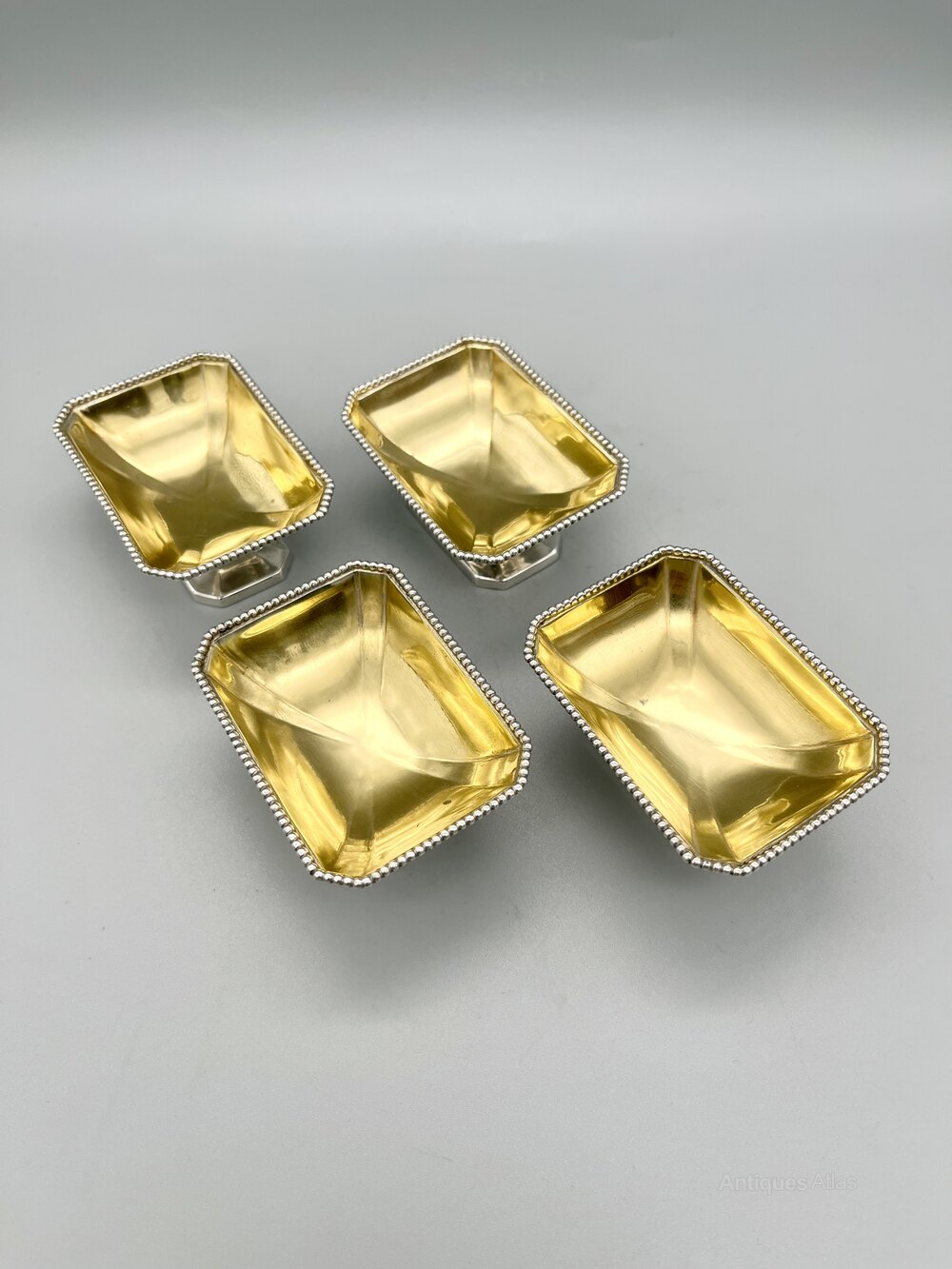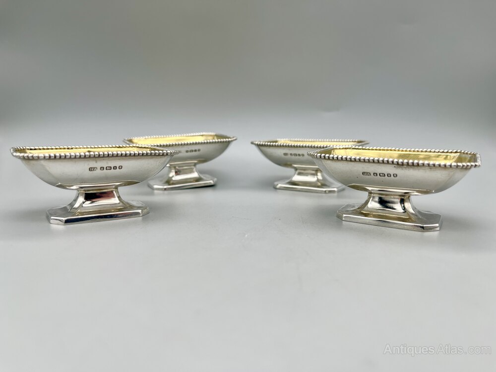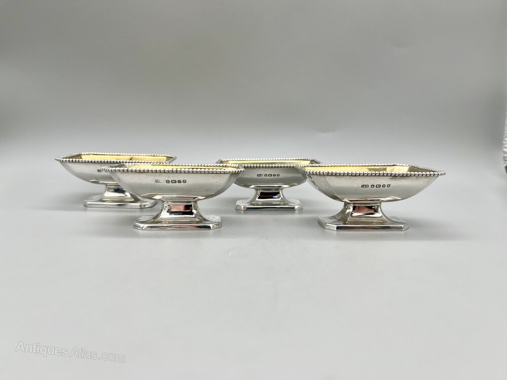 Here we have a superb Set of Four Victorian Sterling Silver Open Table Salts with Gilt Interiors. The pedestal salts are oblong with chamfered corners and beaded rims. There are no initials or personalisation of any kind.
