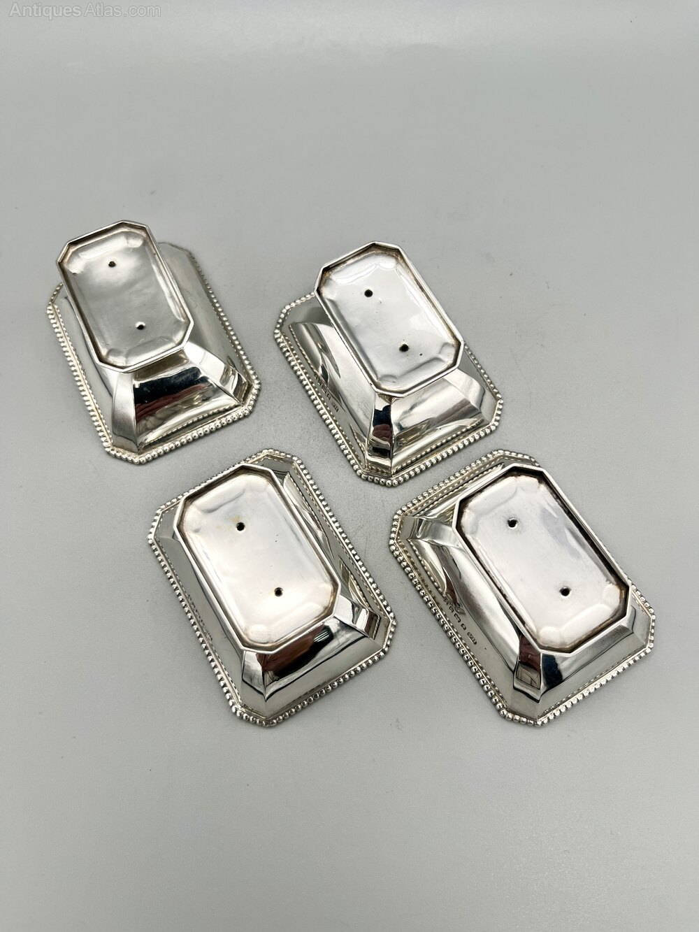 Each salt is 6.4cm / 2.5ins by 4.7cm / 1.8ins and stands 2.8cm / 1.1ins high. The set of four together weighs in at a substantial 145.8g / 5.14oz of solid Sterling Silver.