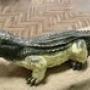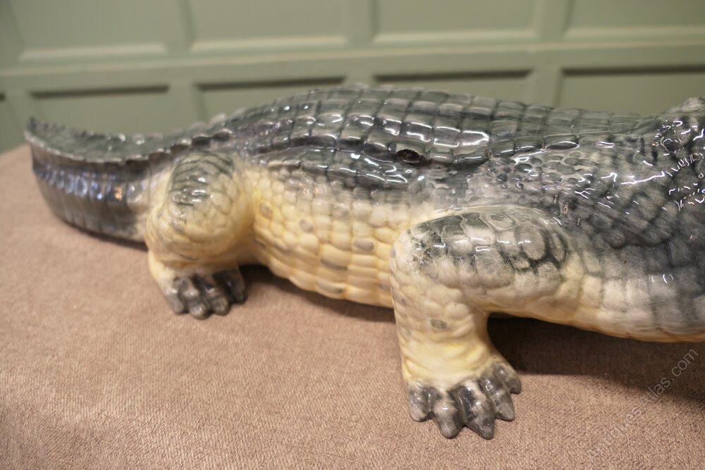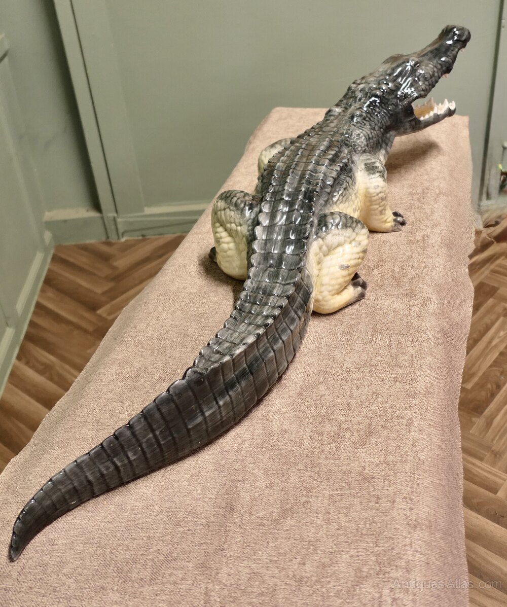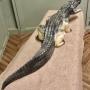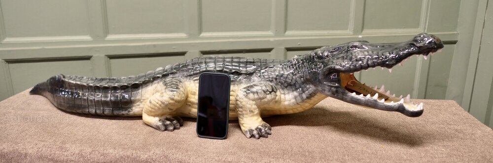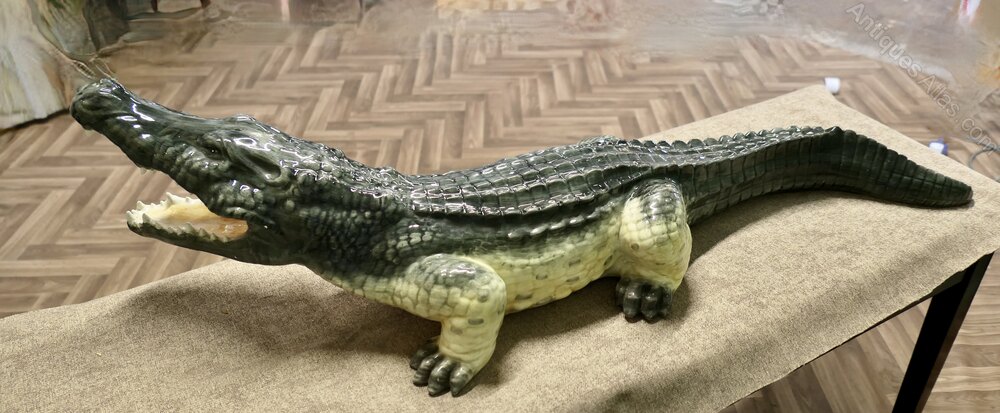 This is a unique hand made ceramic polychrome piece, the detail of the rough skin and barbed teeth is very realistic. He is walking with his tail swishing and his mouth wide open