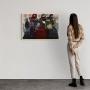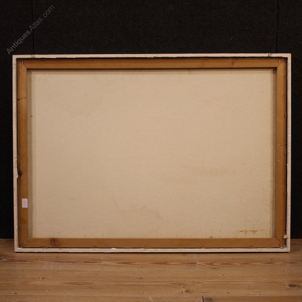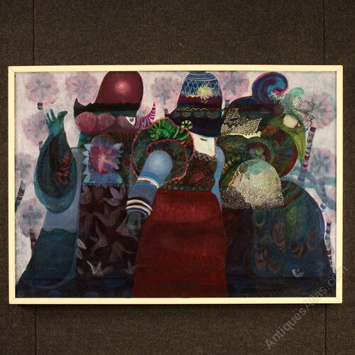 Italian painting from the second half of the 20th century. Mixed media artwork on canvas depicting a surreal subject, masked characters, signed lower right S. Carpini. Painting by style and signature attributable to the famous Tuscan painter Simonetta Carpini, lacking authentication. Painting that develops horizontally adorned with a simple wooden frame. Painting characterized by bright colors and pleasant contrast, for antique dealers and collectors of Italian paintings. In good condition. Interior size H 69.5 x W 99 cm.