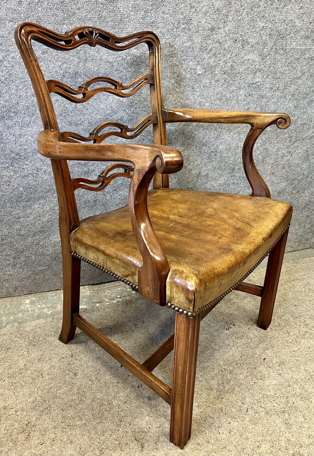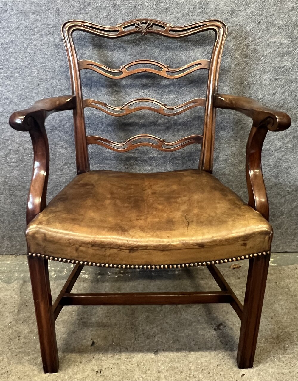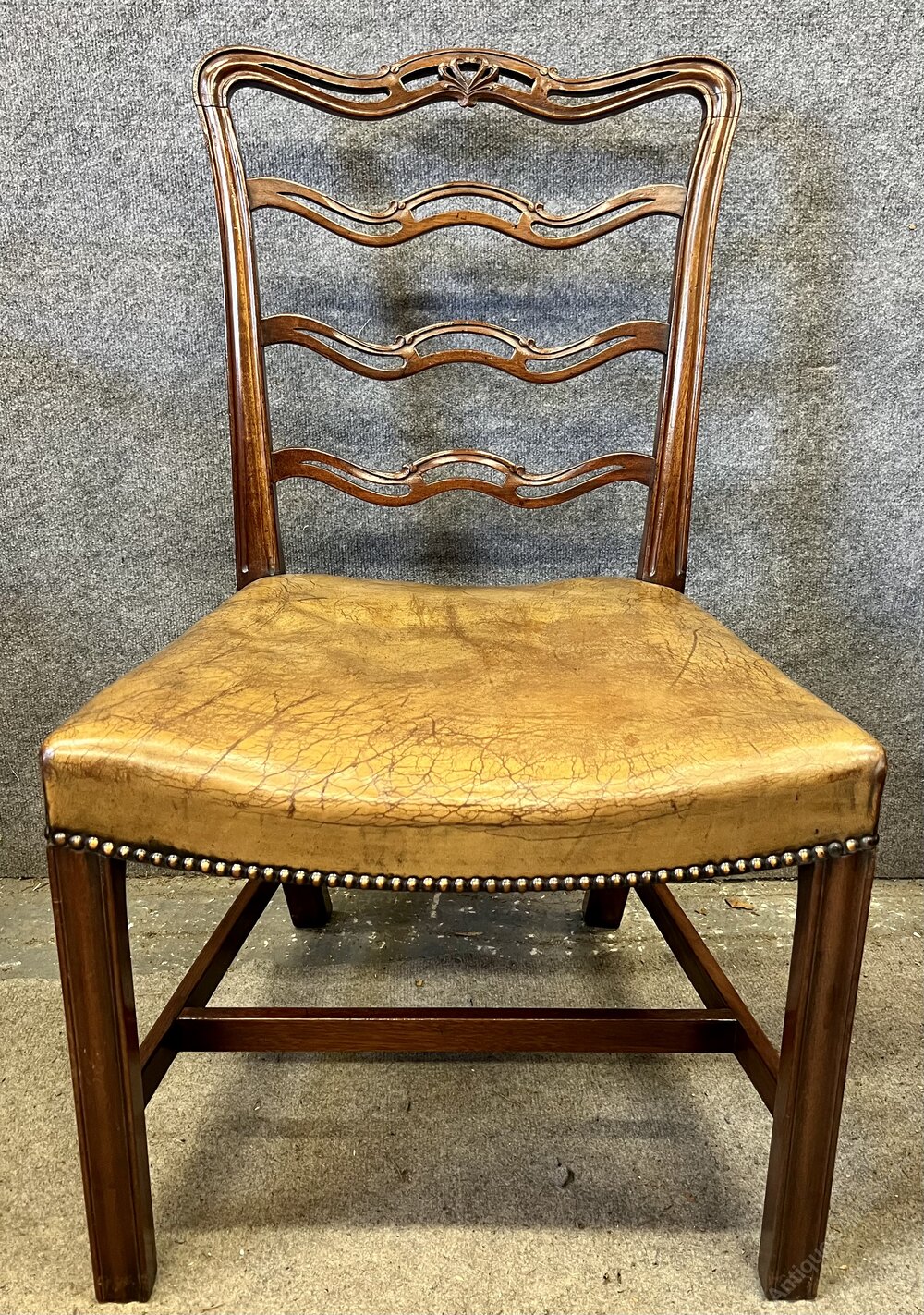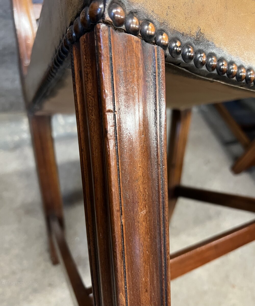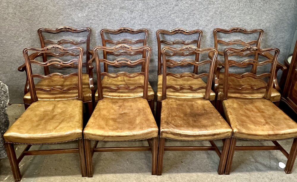A good set of 8 (6 + 2 carvers) 18th. C., Chippendale style mahogany dining chairs. The shaped and pierced ladder backs having carved honey suckle detail to their top rails. The elbow chairs having shaped open arms with scrolling ends. The saddle shaped seats retain the original hand dyed olive green leather seats with brass studded detail. The leather seats show signs of age and use but are perfectly serviceable with no tears or splits. The chairs are raised on moulded front legs joined with “H” shaped stretchers and out-swept back legs. Condition- Very good, strong frames and no damage. Dimensions:- Side Chairs. Height…36’’/ 91.5cm. Width…21.5/ 54.5cm. Depth…21.5’’/ 54.5cm. Elbow Chairs. Height…36.5’’/ 92.5cm. Width…26’’/ 82.5cm. Depth…22’’/ 56cm. Delivery by furniture carrier £90.