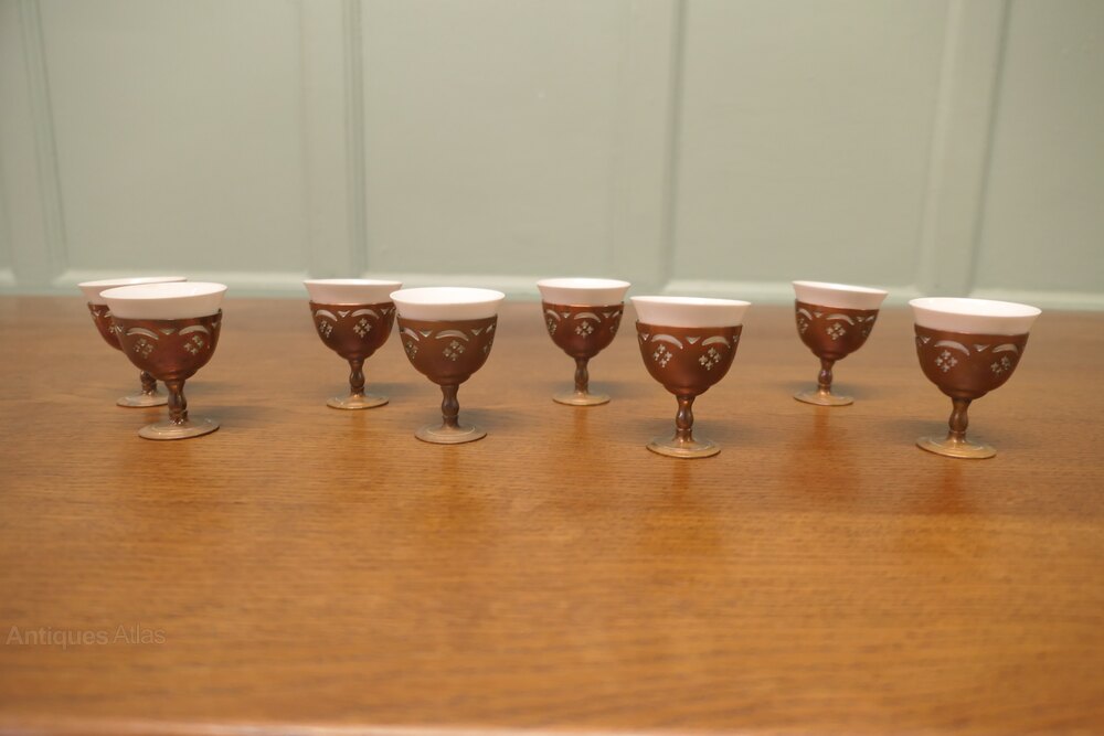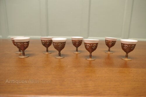 This is a very unusual set of 8 egg cups each with a french ceramic liner signed by Picards Ltd of London
