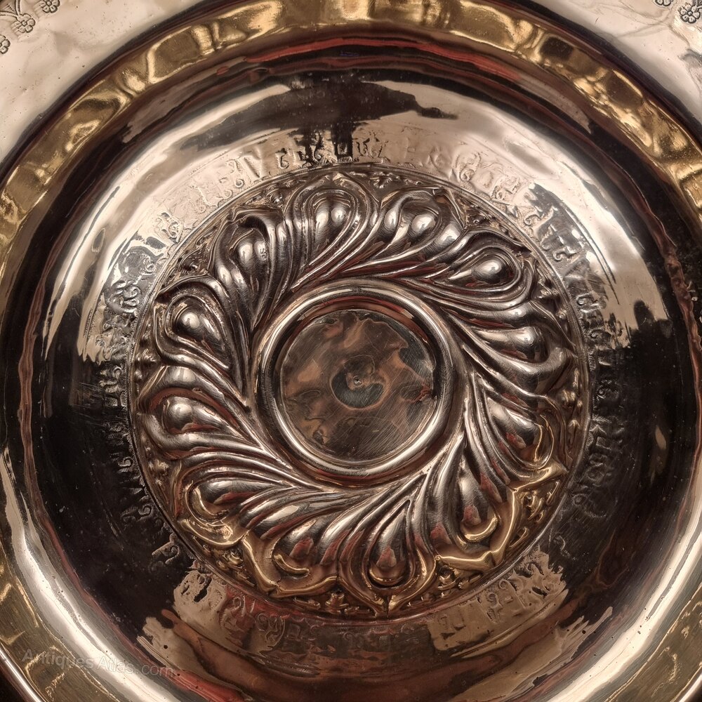 A brass alms dish dating to the second half of the 16th century made in Nuremberg, Germany.