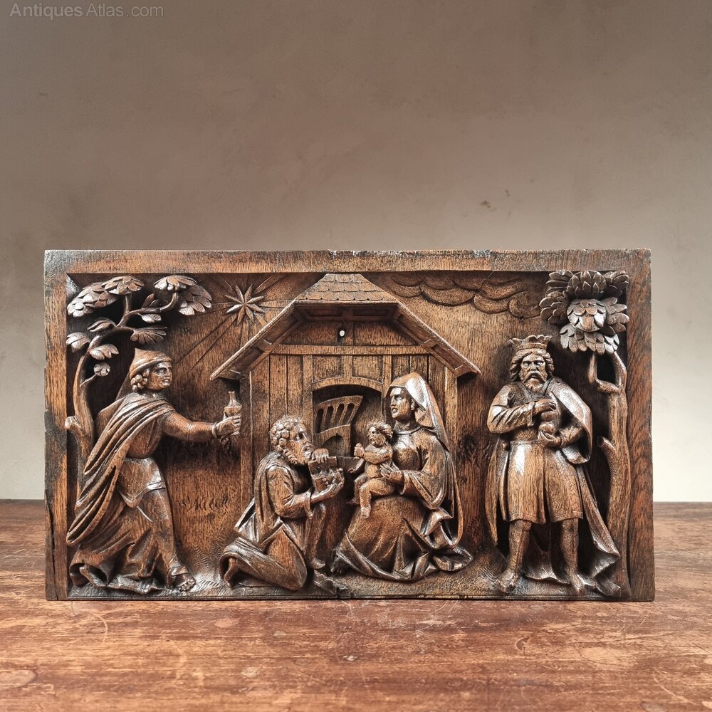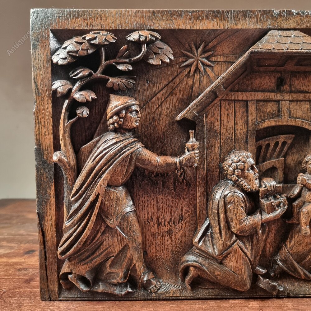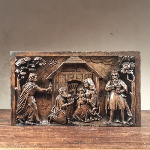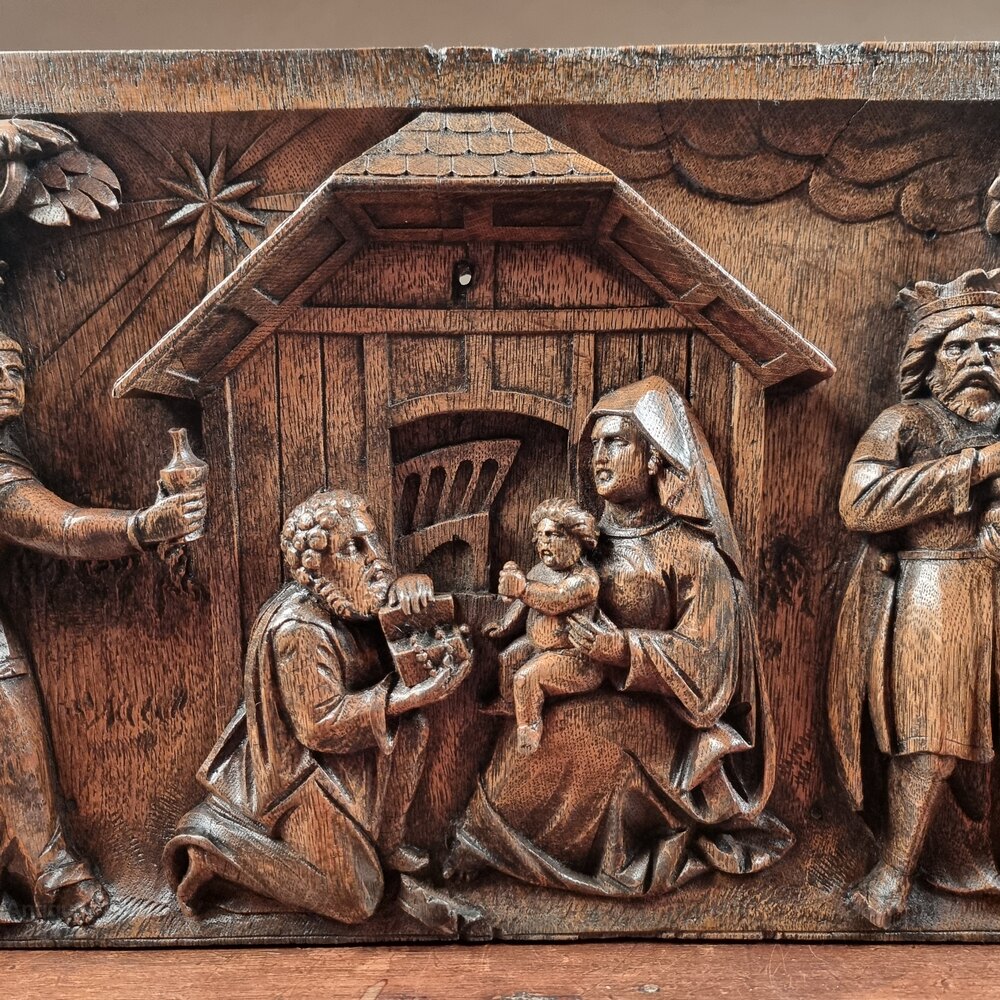 A 17th century flemish panel , finely carved in oak depicting the nativity.