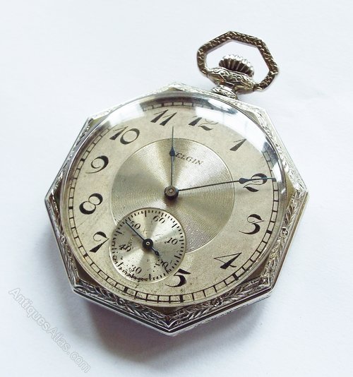 The watch itself measures 46mm diameter excluding the winding stem and the loop. The case was made by the Star Watch Case Company and it is the Scepter white gold filled model. Star made cases for several watch companies including Hamilton, Longines, Elgin, Gruen and Omega This particular case is beautifully detailed with an Art Deco design and it is in superb condition. There is a blank cartouche to the case back.