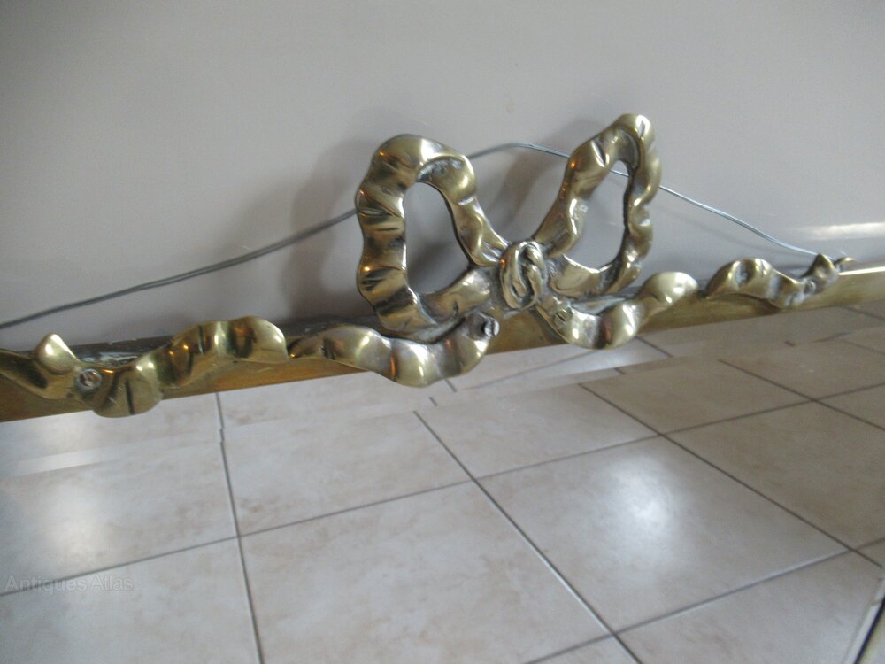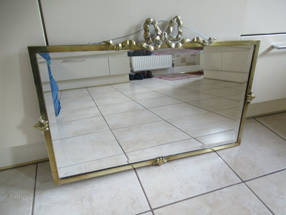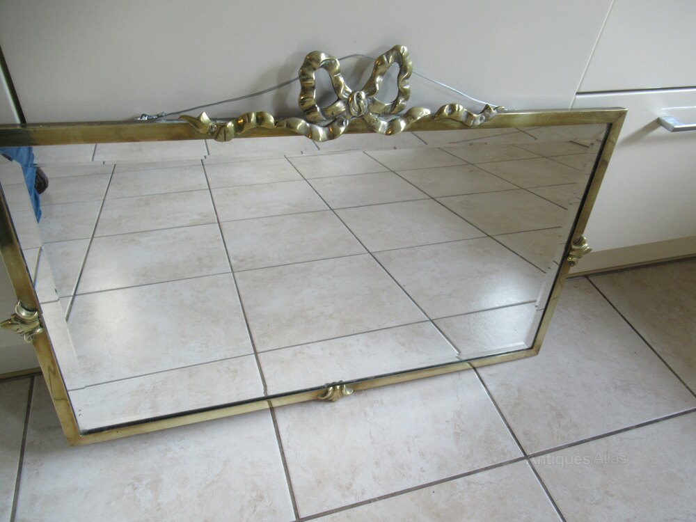 1930S Brass framed wall mirror, with a bevel edge mirror glass, The mirror has a thin solid brass frames, with a decorative top bow top of the frame.