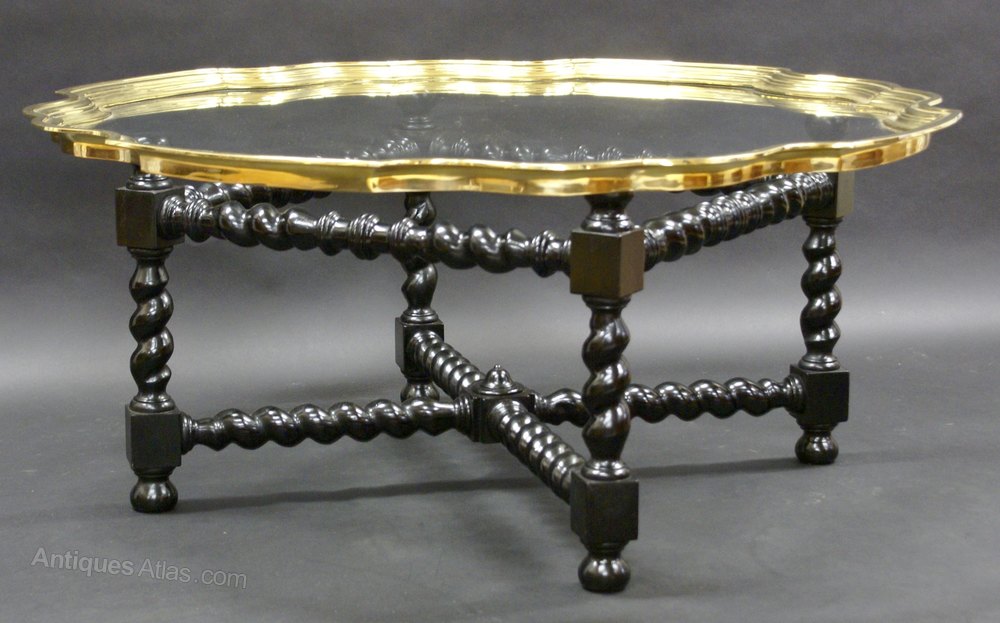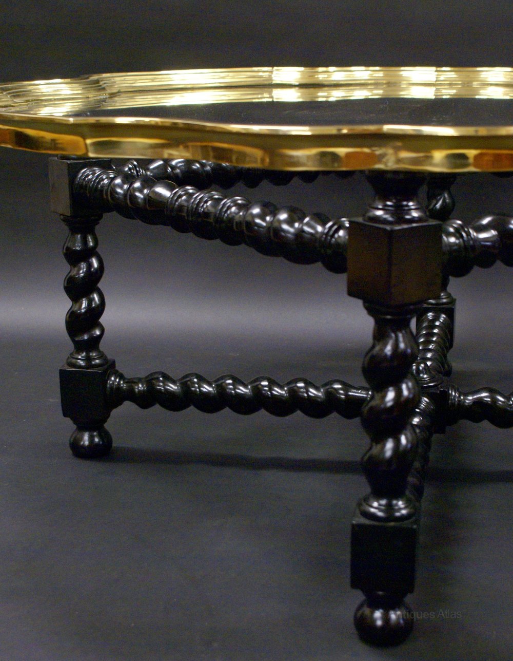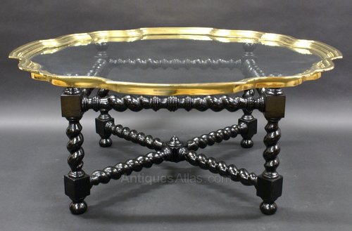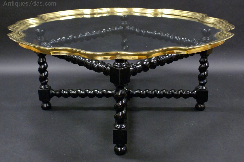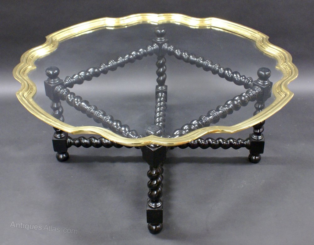 With a plate glass top and large brass "piecrust" molded edge, the table stands on an ebonised "barley twist" base with cross stretcher. In very good condition. 500mm high and 1100mm diameter. Circa 1930.