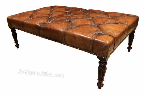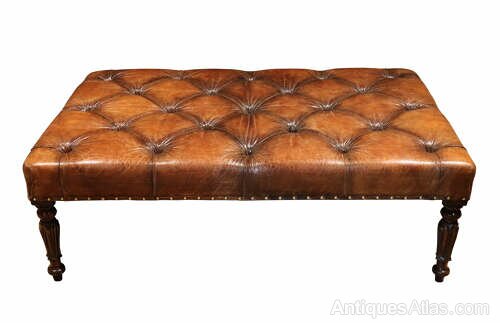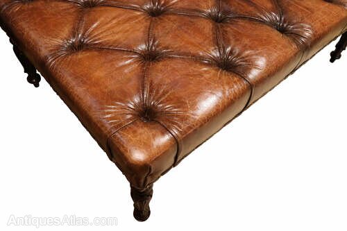 A handsome and generously proportioned 19th-century stool, later extended in the early 20th century to create a practical coffee-table height. The original mahogany frame is raised on four well-carved legs, each with pronounced lotus-leaf decoration above turned feet.