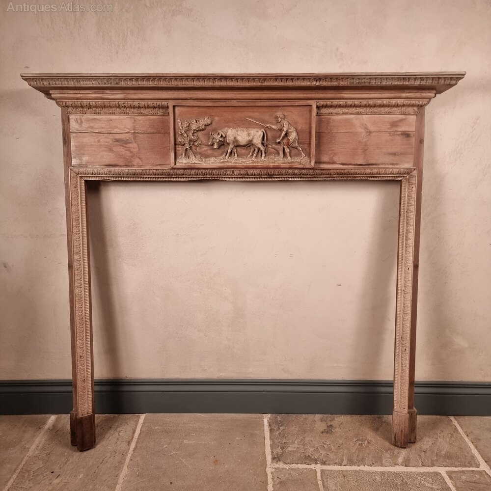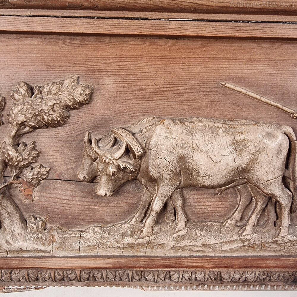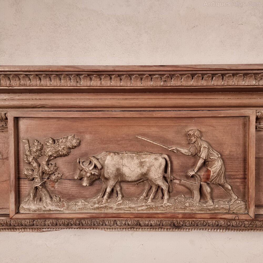A 19th century carved pine fire surround with an unusual center plaque made from composite depicting a farmer ploughing with and ox. The surround is decorated with carved acanthus leaves and small rows of ing. The is a few areas with losses and some minor damages which we could give you a price to be repaired if you wish.