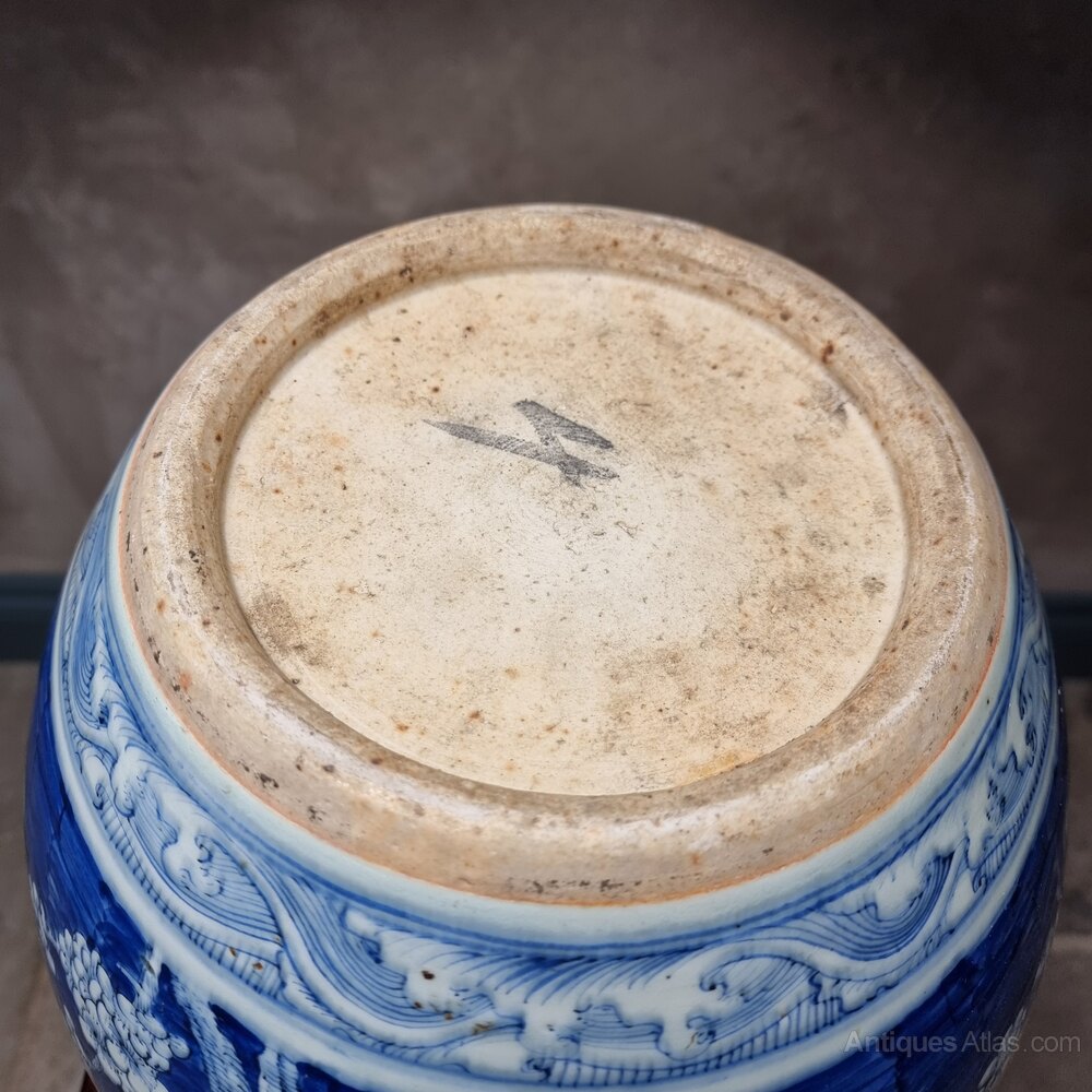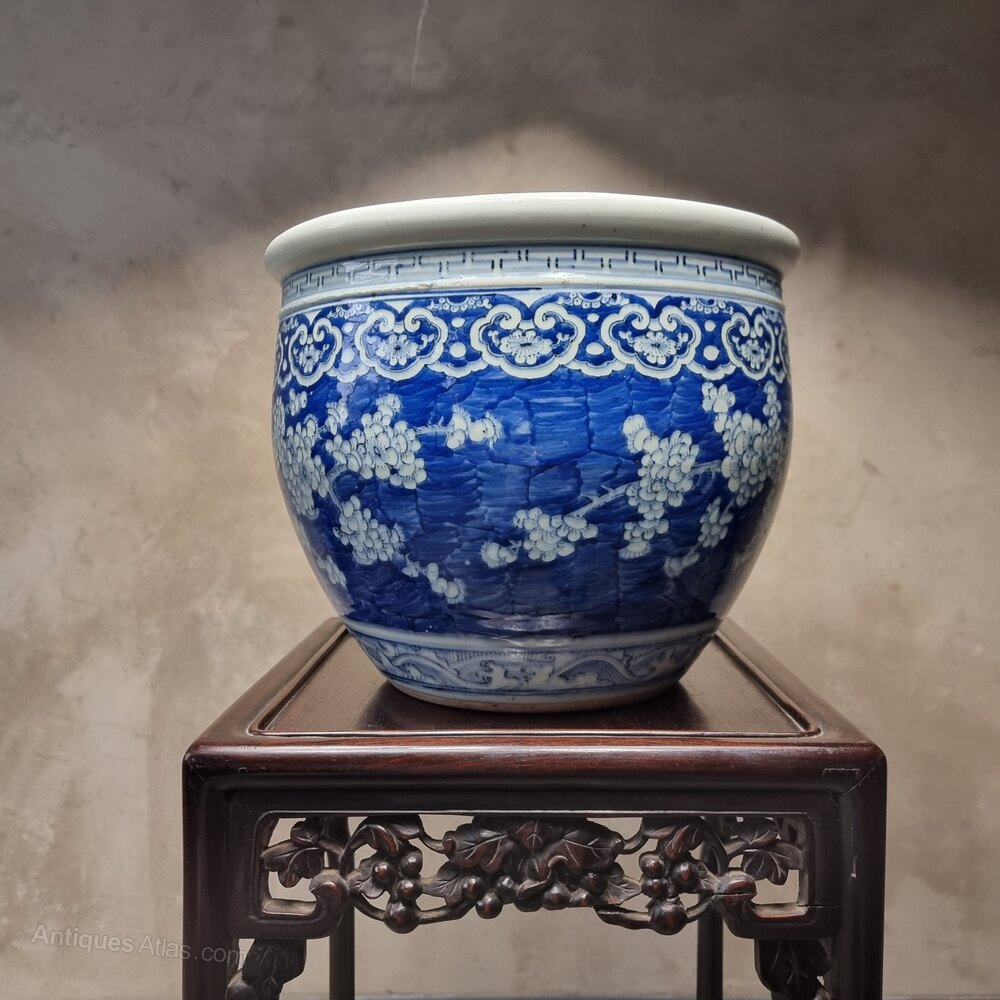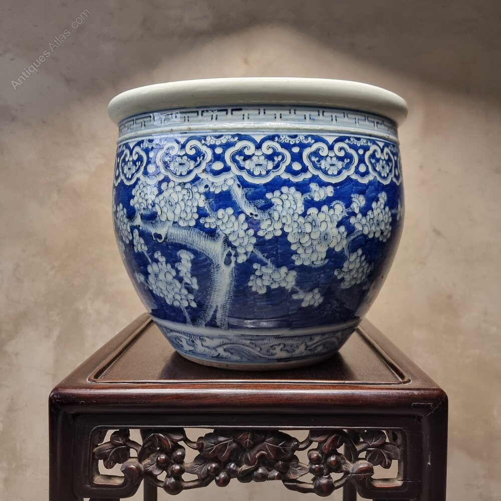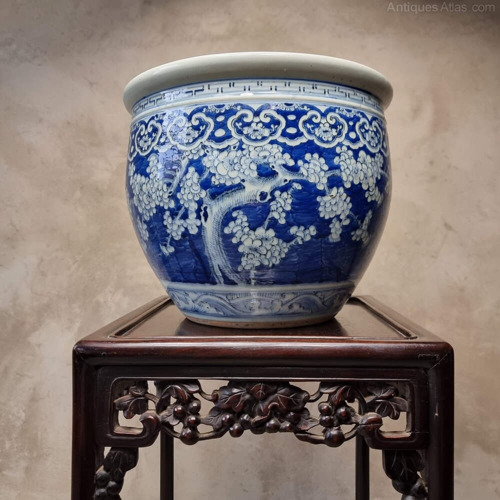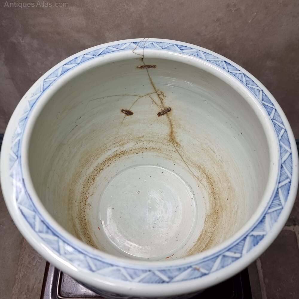 A beautiful 19th century Chinese jardinière decorated in shades of cobalt blue with a continuous design of blossoming prunus trees in reserve on a blue ground above a band of waves to the base and below geometric bands to the shoulders. The jardeniere has some age related cracks/damage and old staple repairs on the inside, but is still in good order for its age and very decorative, perfect for your indoor plants.