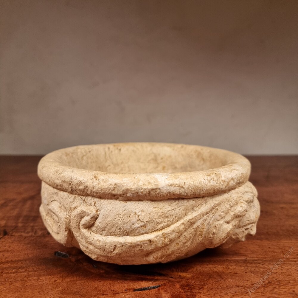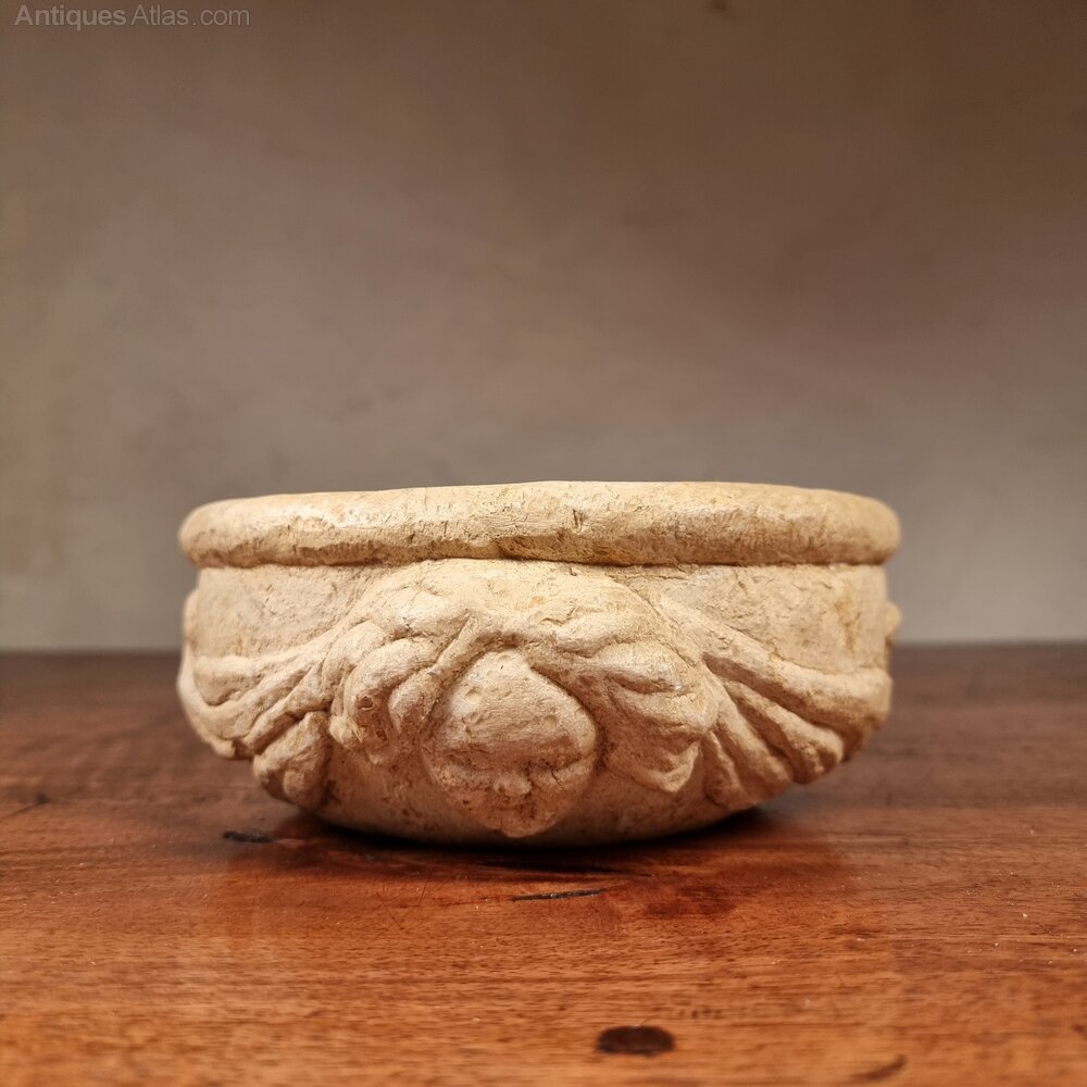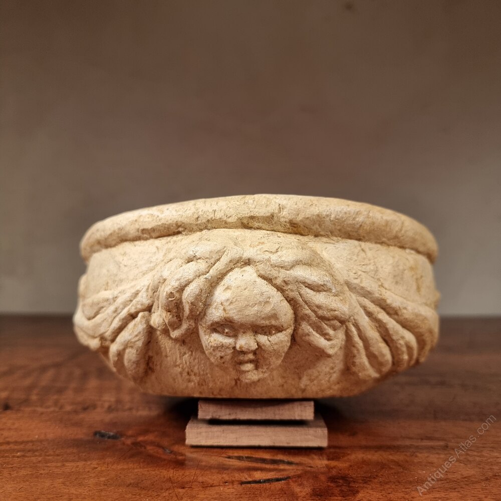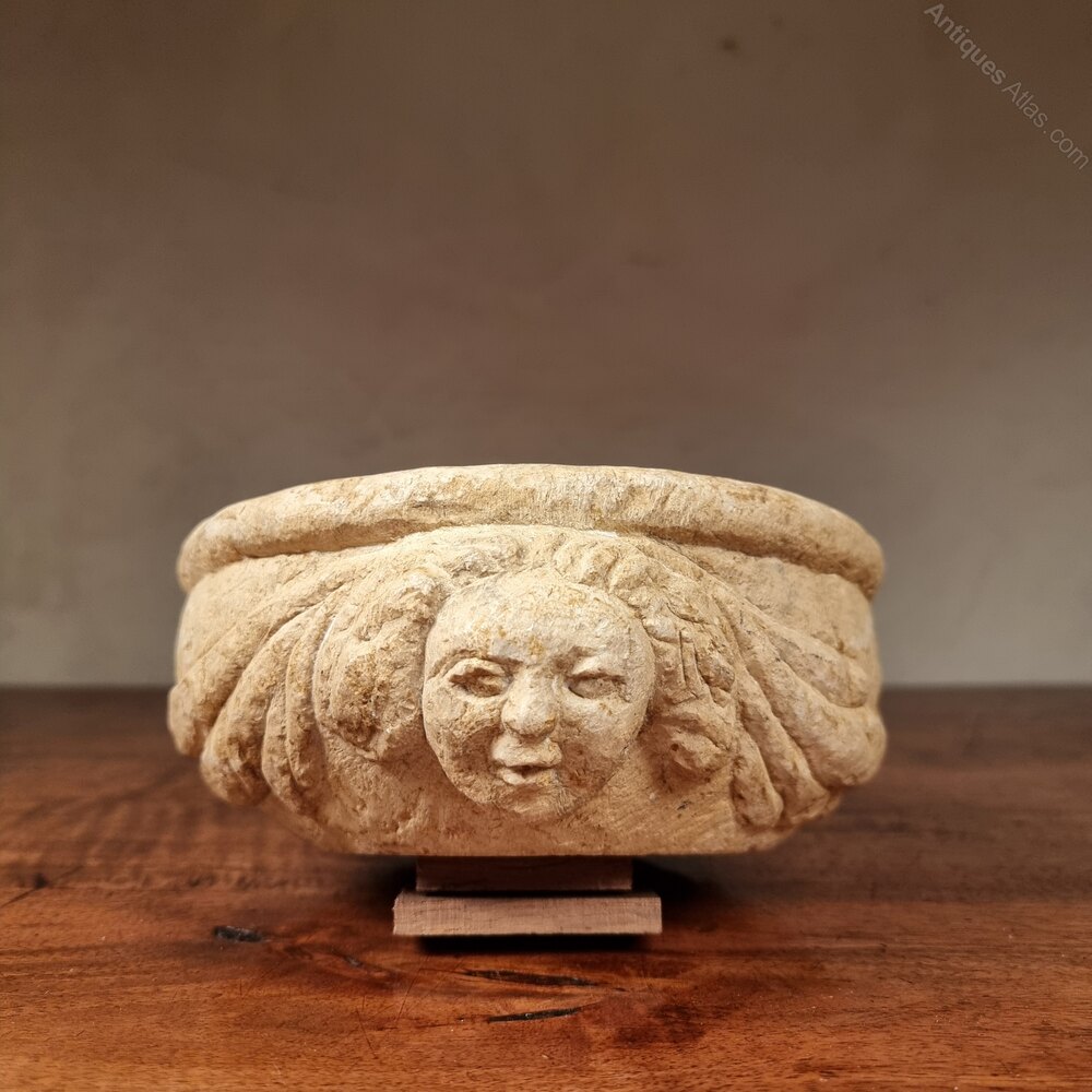 A 19th century renaissance revival bowl , probably carved by an apprentice stone mason. The bowl is decorated with two projecting faces and is in good condition.