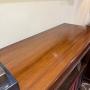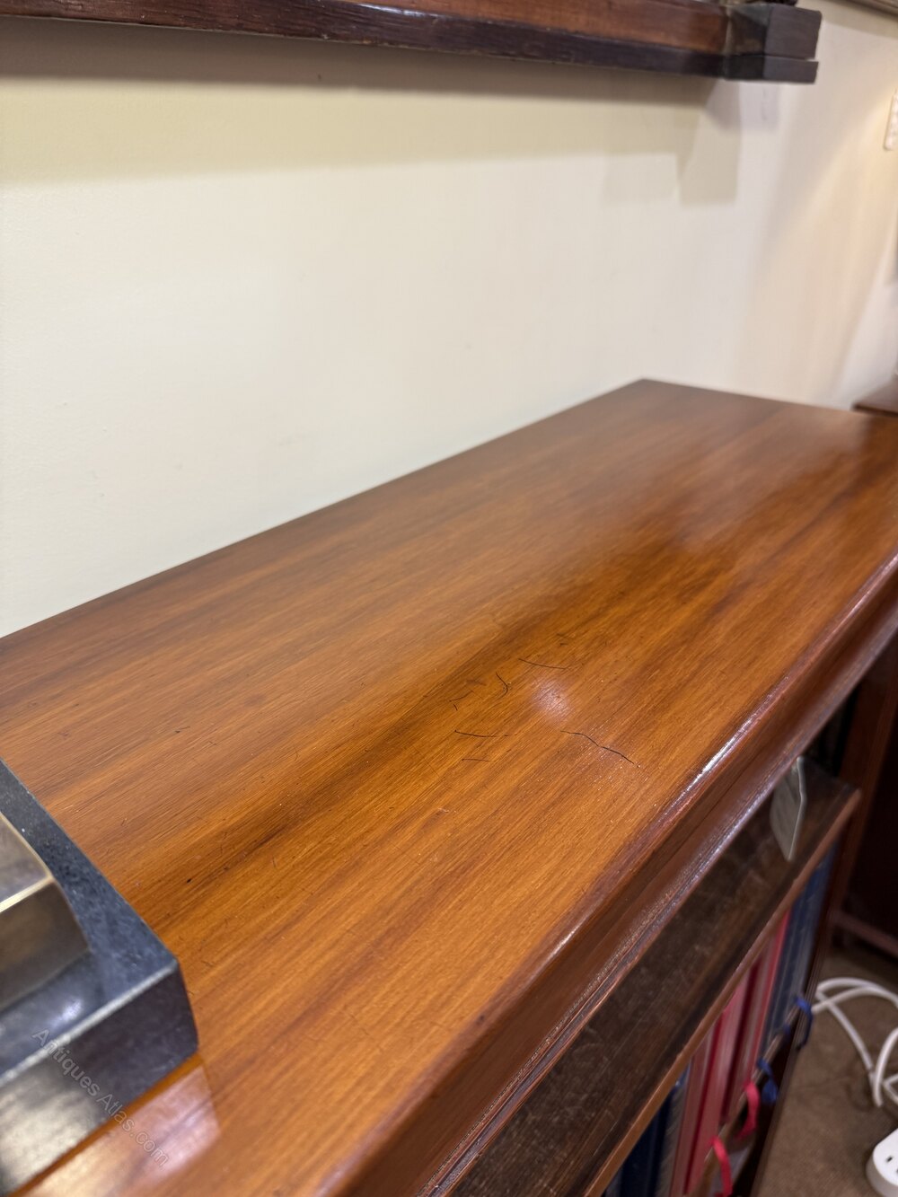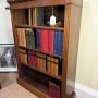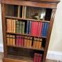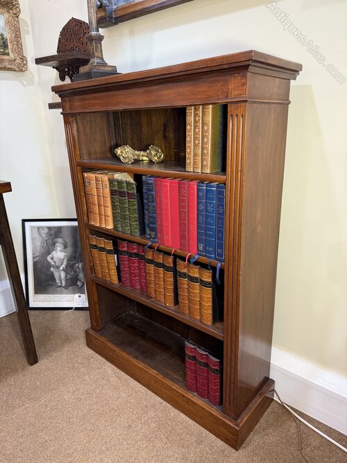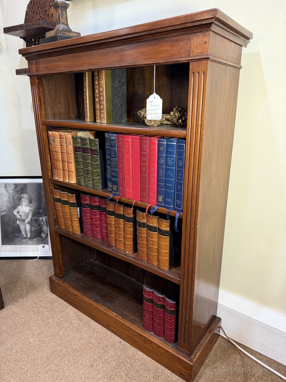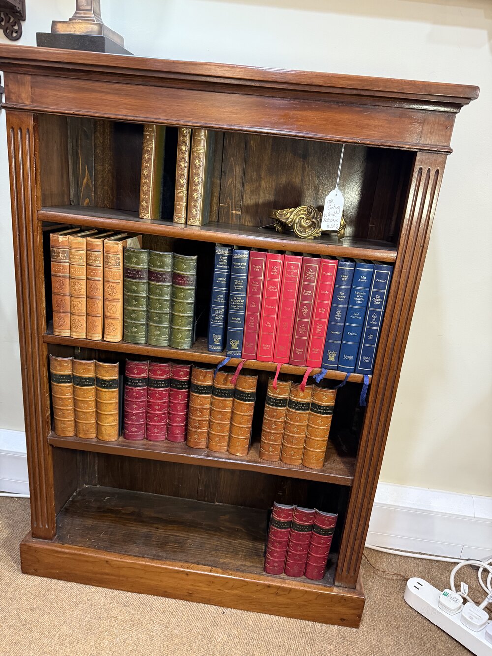 A quality three adjustable shelves walnut open bookcase with an overhung to.