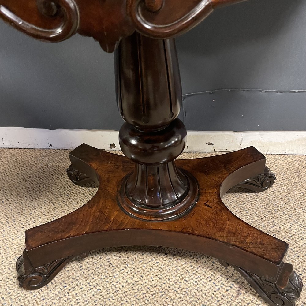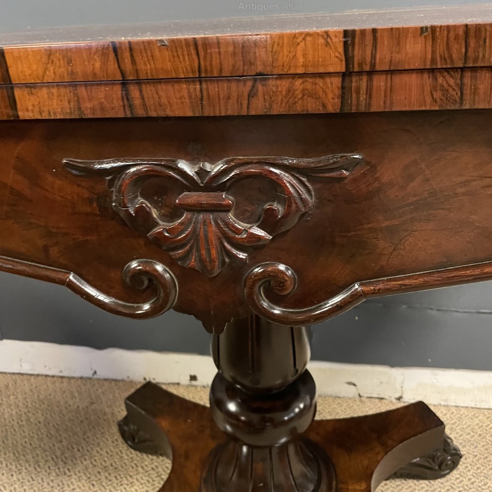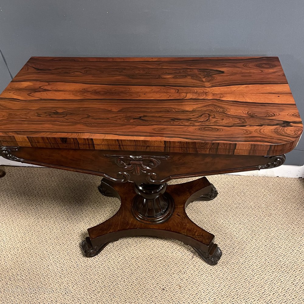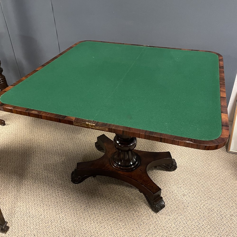 A Superb 19th Century Rosewood and Mahogany Fold Over Card Table, the twist folding top opening to a green baize playing surface, raised on a central column with splayed scrolled supports with castors