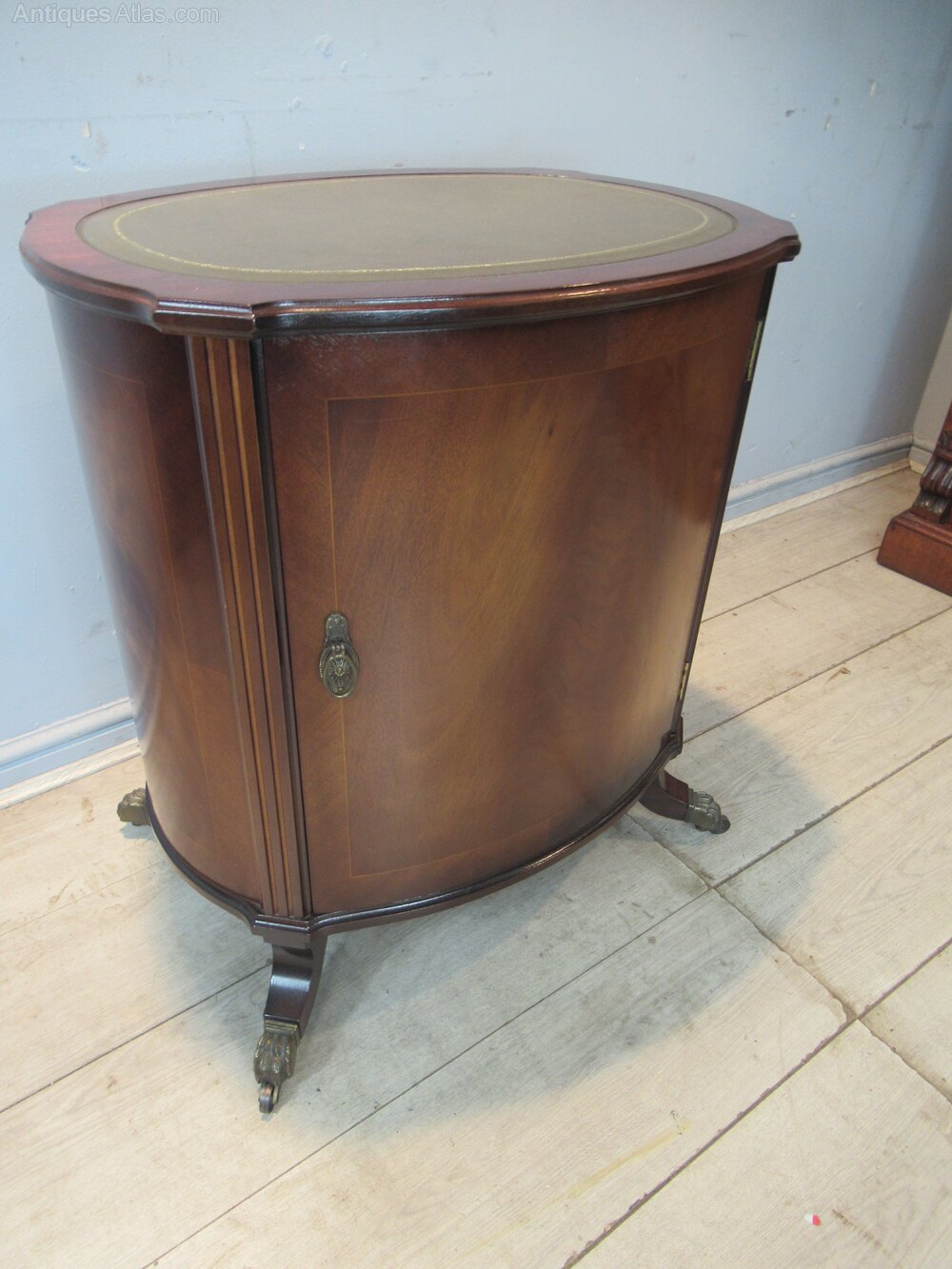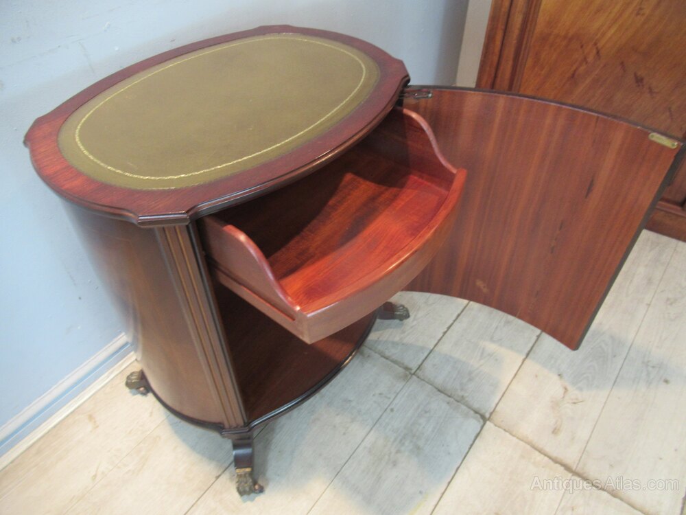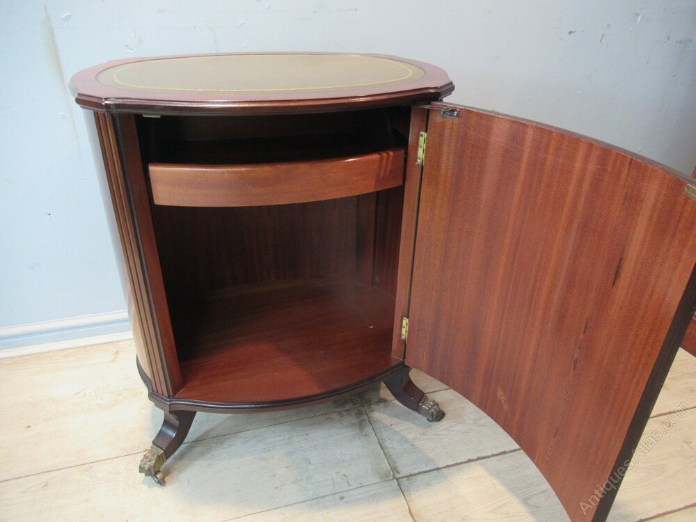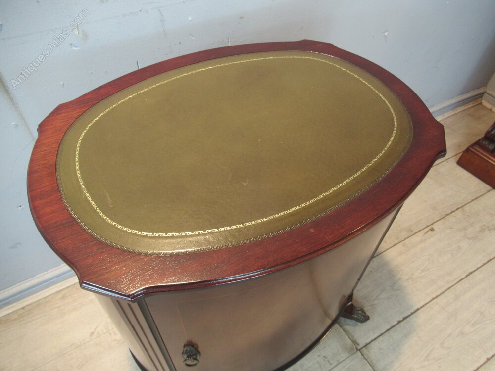 A small oval mahogany side cabinet or lamp table . With a inset green leather liner to the top. Standing on slay out legs with metal paw casters. The inside has a small drawer,