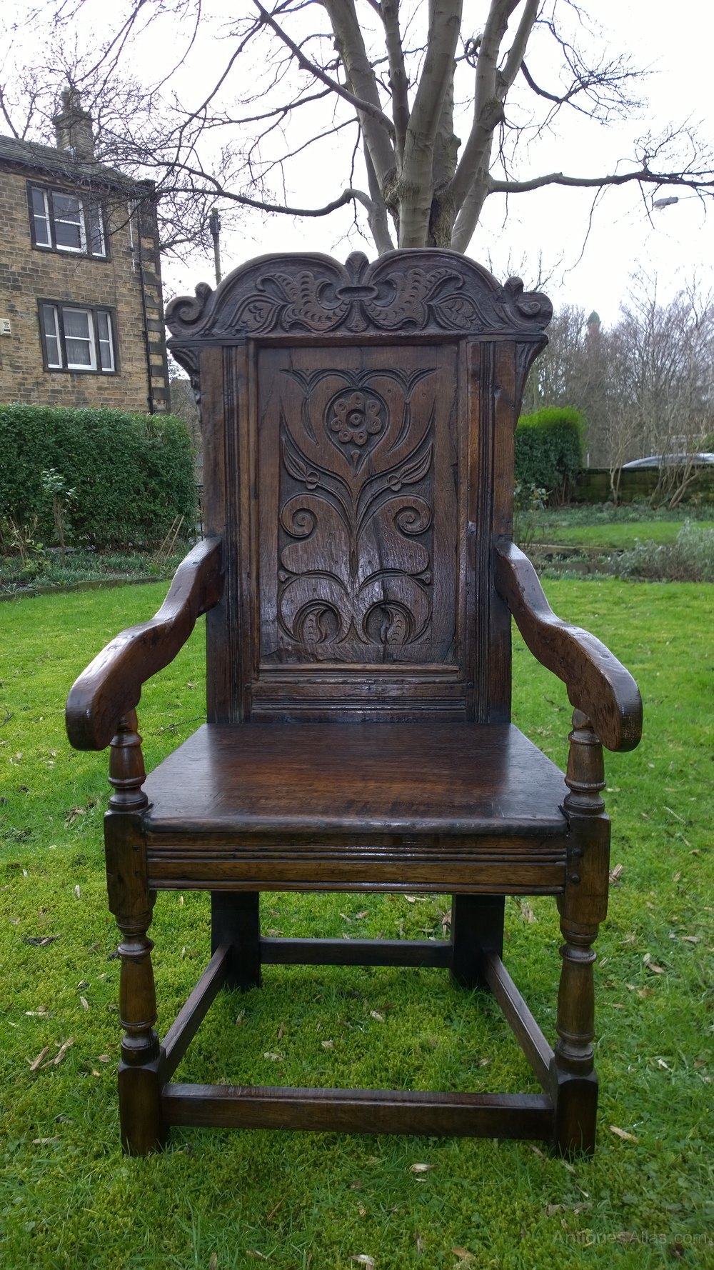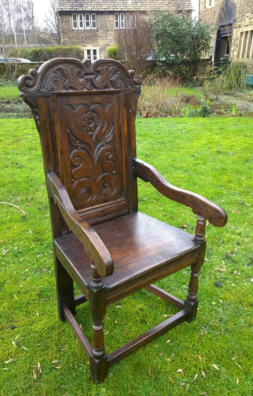 The seat made from 1/2" thick English oak flanked by characteristic down-swept arms resting on turned balusters.