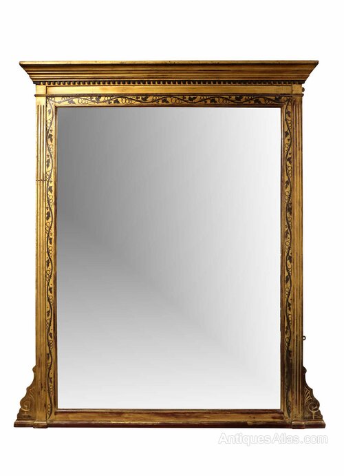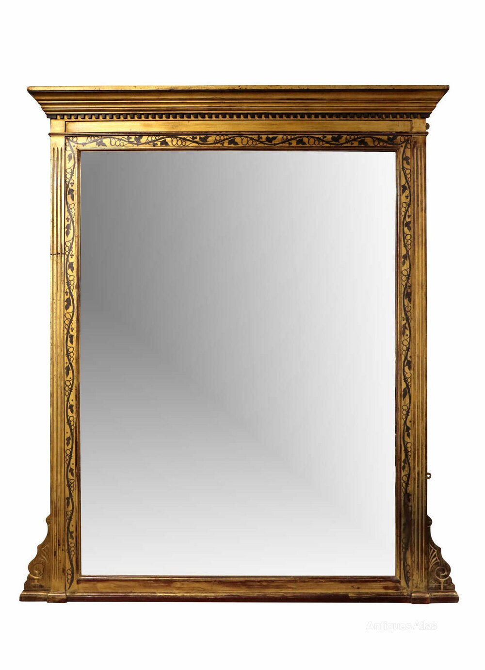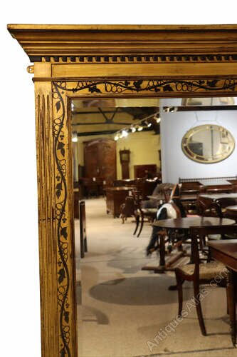This elegant early 19th-century mirror is set within a richly ornamented giltwood frame of strong architectural form. The frame is surmounted by a bold stepped cornice with dentil moulding, above fluted uprights and a finely detailed inner border decorated with scrolling foliate and vine motifs, all delicately picked out in contrasting dark detailing. The proportions and restrained classical ornament place the mirror firmly within the late Georgian / early Regency period.