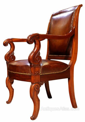 The arms terminate in finely carved scroll supports, echoed in the shaped front legs, which end in elegant swept feet. Subtle carved detailing to the arm supports and legs provides visual interest without detracting from the refined overall form. The rear legs are splayed for stability, typical of quality Regency seating.