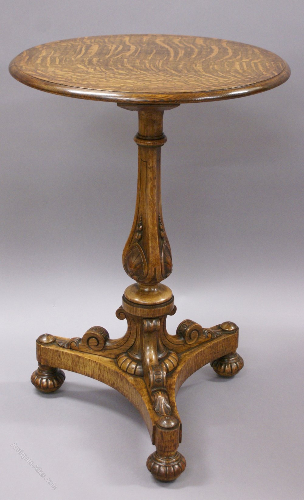 In quarter sawn, highly figured English oak, this delightful table stands on a triform base with turned and carved feet, carved supports and column leading up to the circular top with a double inlaid banding. In very good condition. 740mm high and 490mm diameter. Circa 1860.